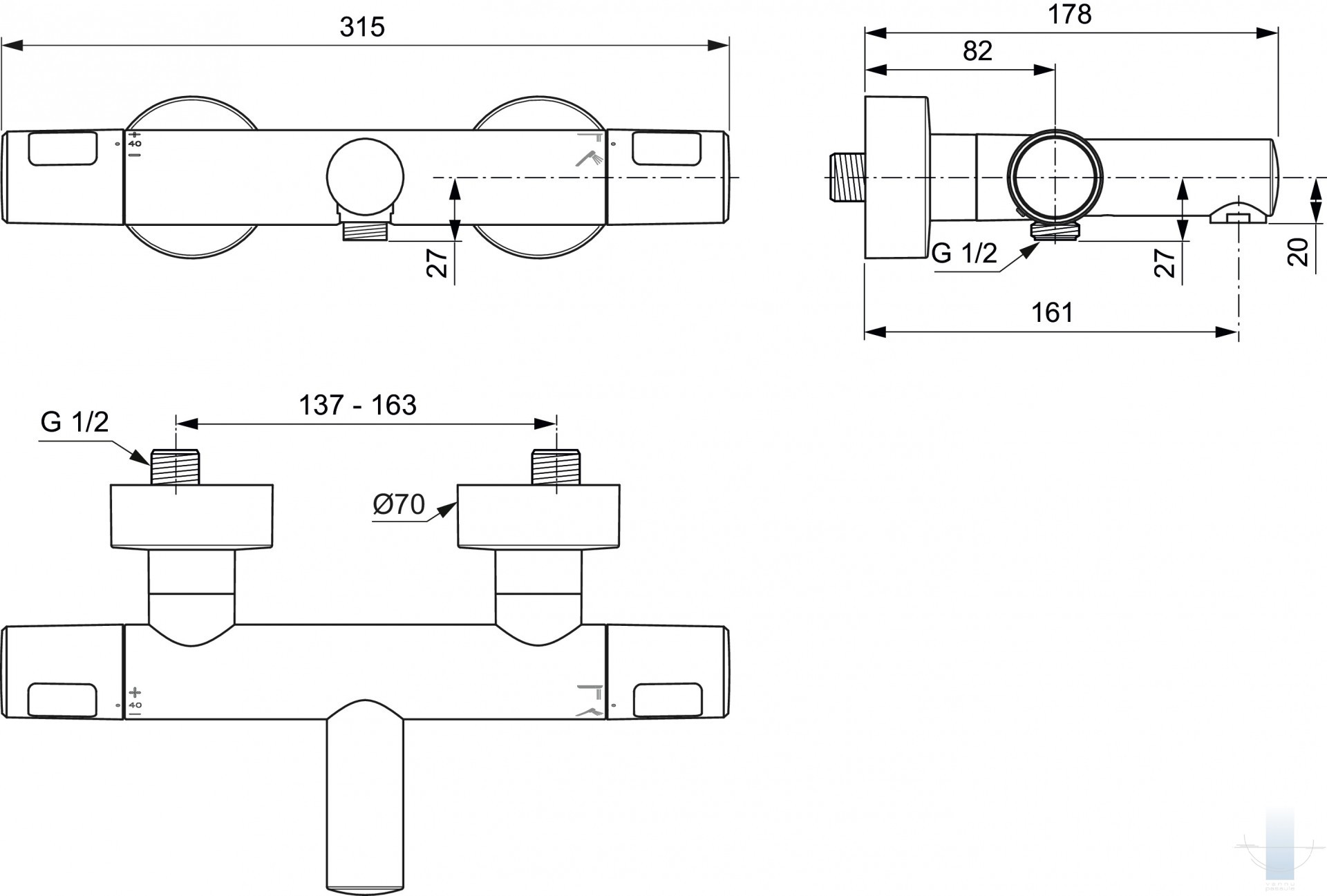 Ideal Standard - Ceratherm T25N vannas un dušas termostata maisītājs 163 mm, Hroms