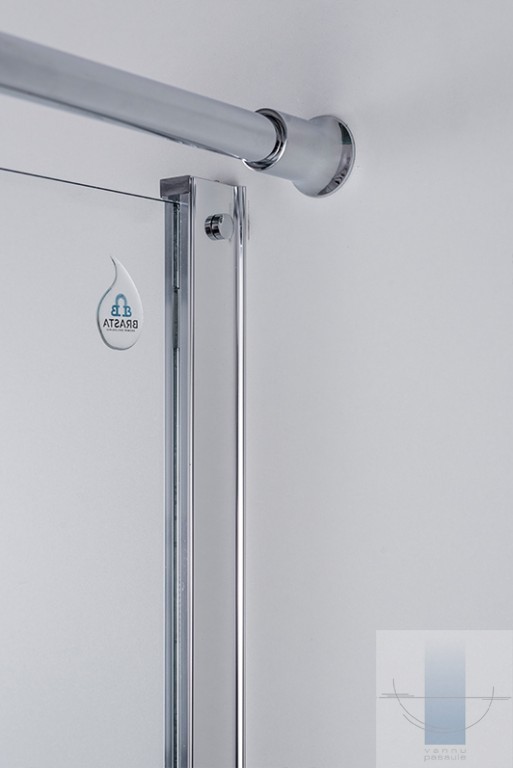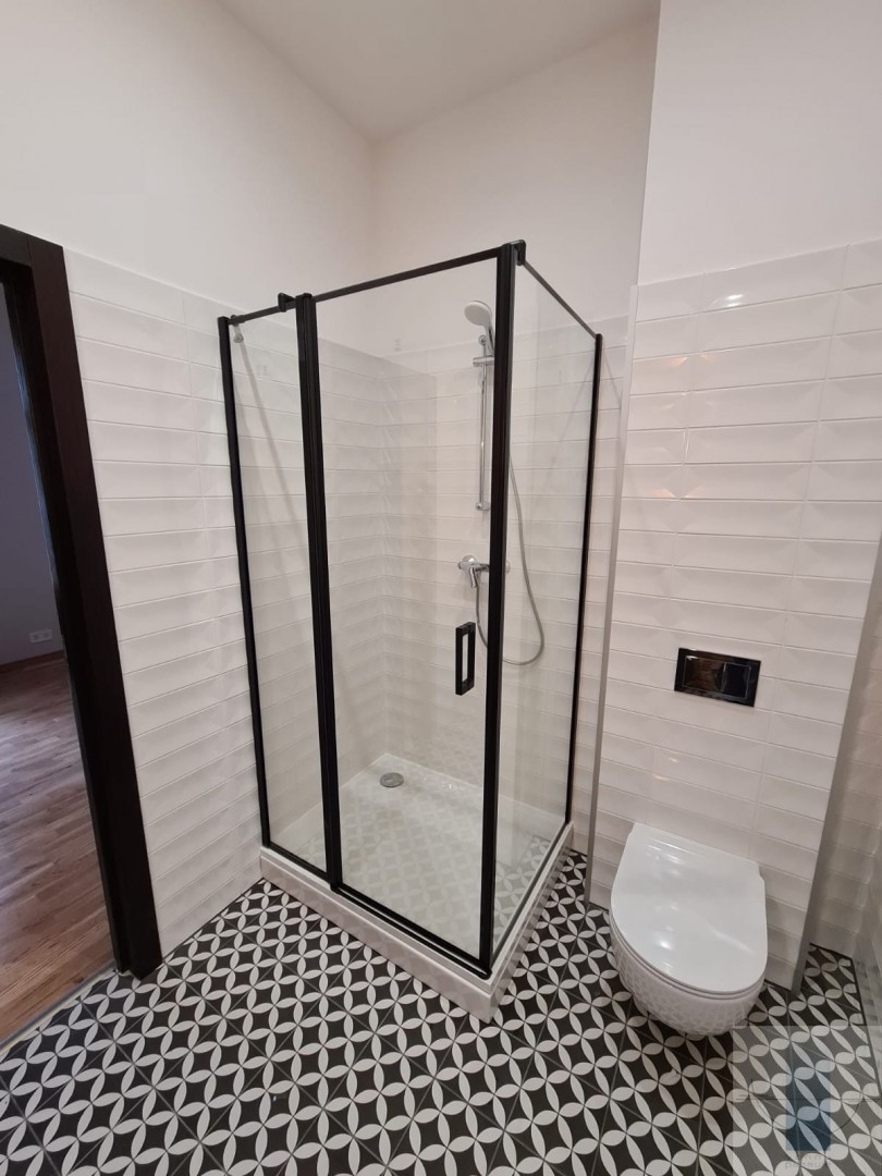 Triecienu izturīga 6 mm bieza caurspīdīga stikla dušas siena ar melnu matētu furnitūru.