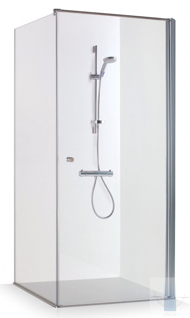 Triecienu izturīga 6 mm bieza caurspīdīga stikla dušas siena ar hromētu furnitūru.