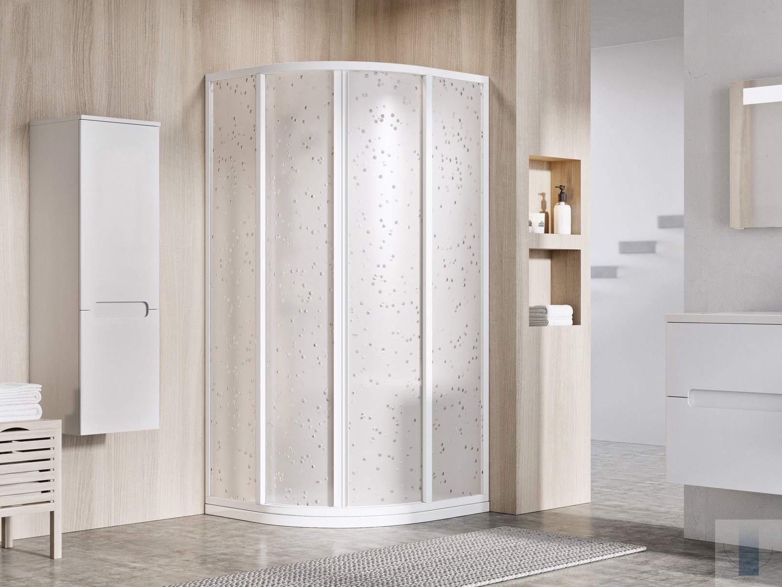 Produkts sastāv no diviem fiksētiem taisniem paneļiem un diviem izliektiem paneļiem, kas veido bīdāmās durvis. Produkts paredzēts uzstādīšanai flīzētā vannas istabas stūrī uz Ravak Ronda, Elipso, Elipso Pro, Elipso Pro Chrome dušas paliktņiem vai tieši uz grīdas ar iebūvētu dušas kanālu vai punktveida noteku.