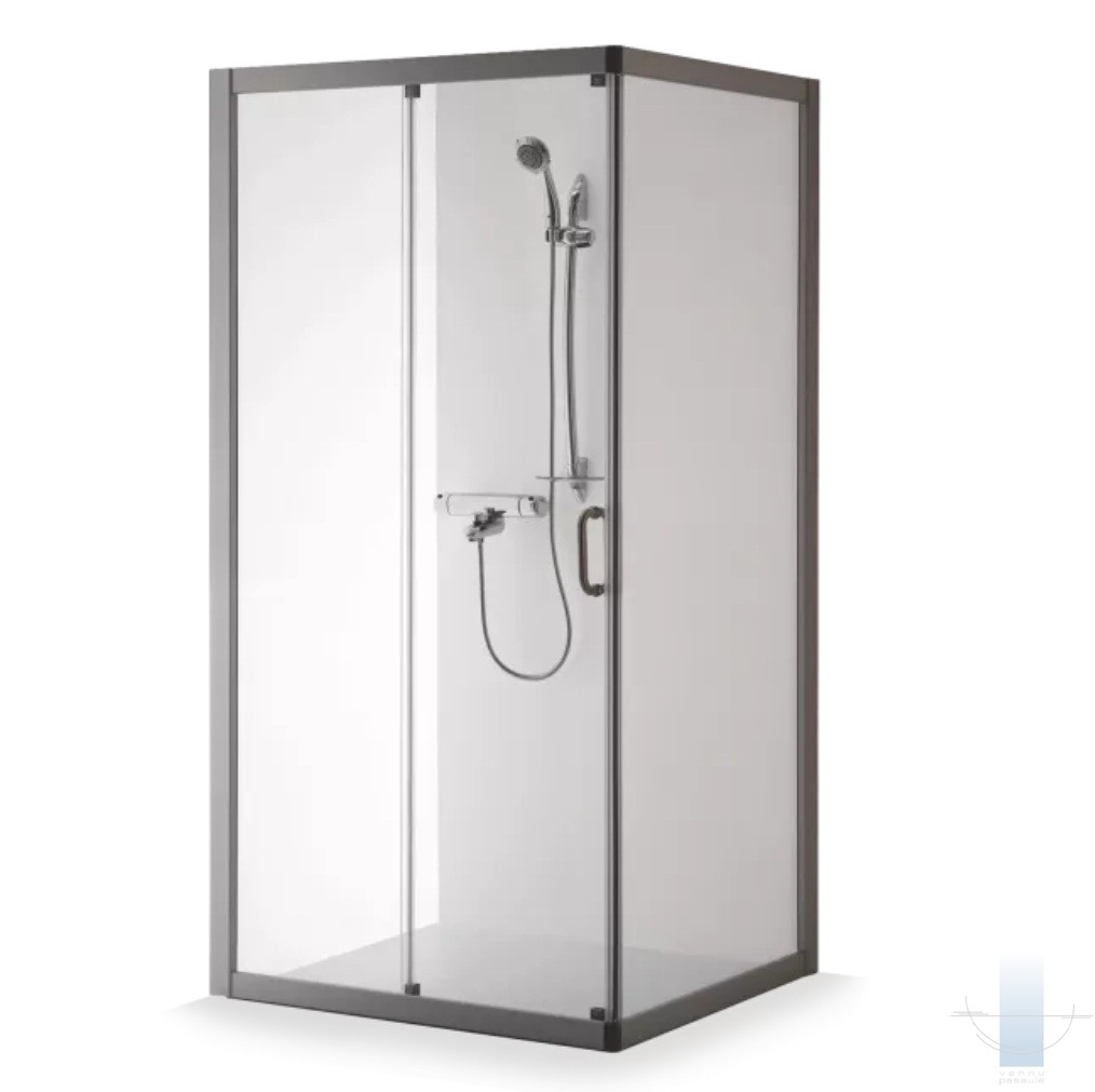 Četru stūru dušas kabīne ar bīdāmām priekšējām durvīm. Ērts un stilīgs risinājums dušai, ārkārtīgi praktisks gadījumā, kad WC moduļa vai cita aprīkojuma dēļ ir nepietiekami daudz vietas atveramajām durvīm. Īpaši hermētiska un droša. Minimālais fasādes platums vismaz 1 metrs, tāpēc dotā kabīne ir vairāk piemērota plašām vannas istabām.