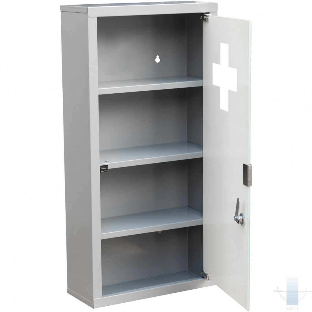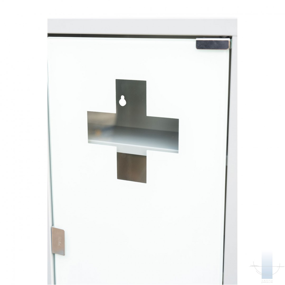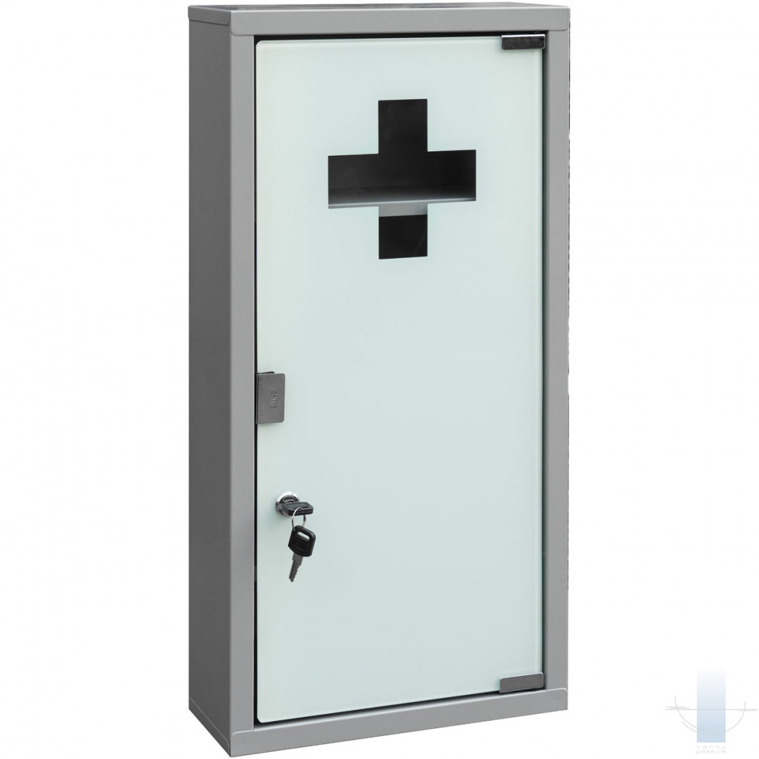 Zāļu skapis ar pelēku rāmi un slēdzamām stikla durvīm ar caurspīdīgu stikla krustu. Pretrūsas apstrādāts pulvera pārklājums. Slēdzene ir standarta tipa un nav klasificēta ar drošību.