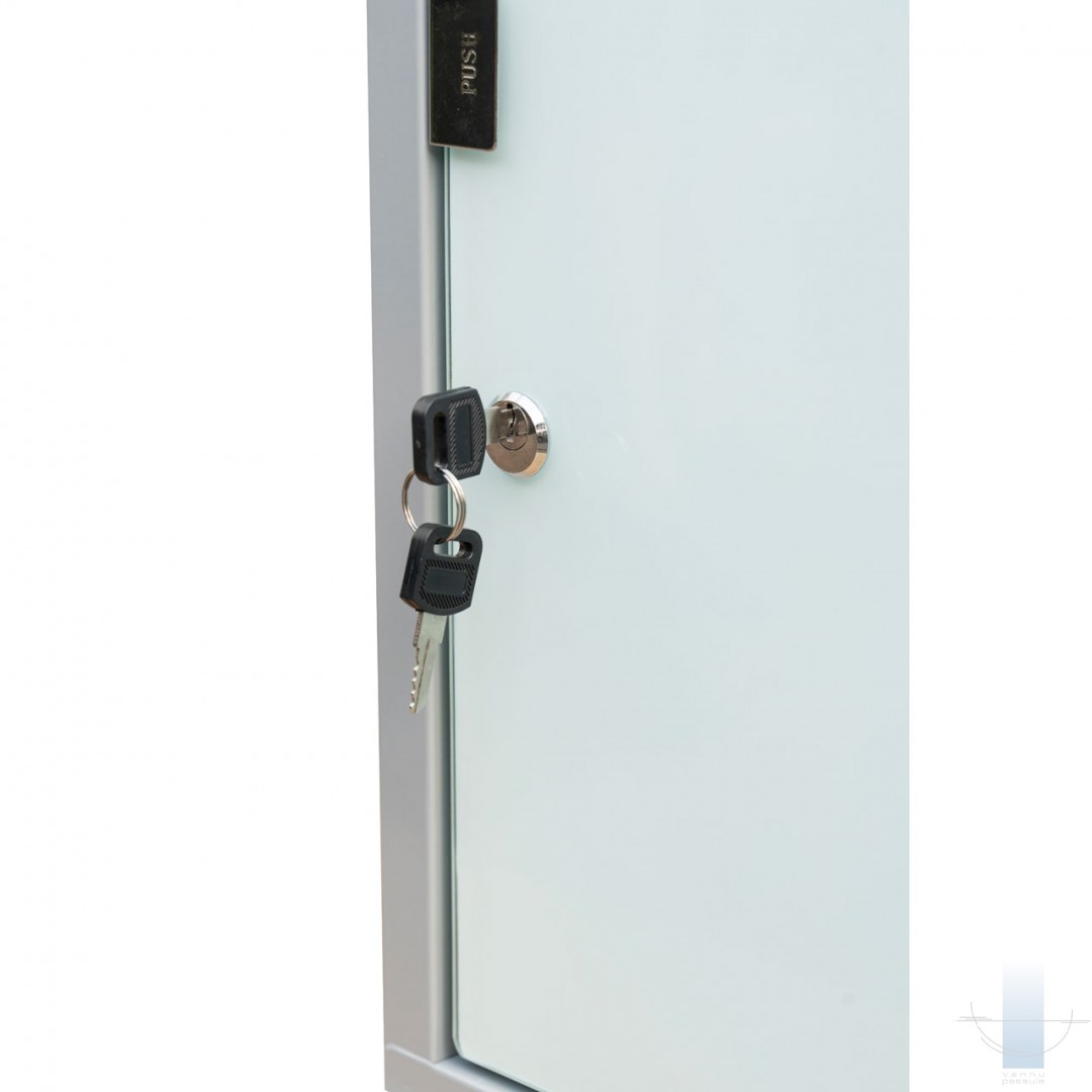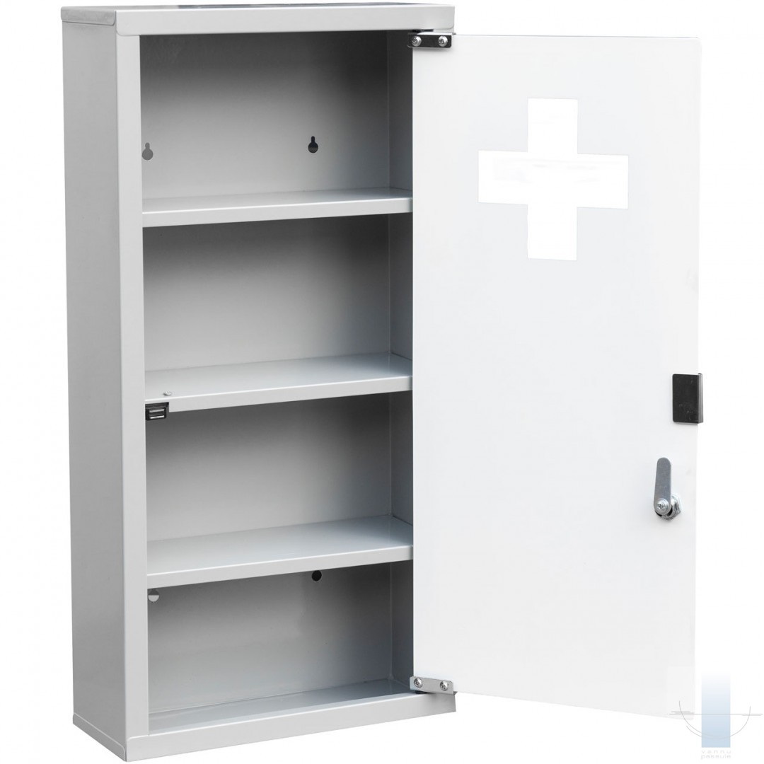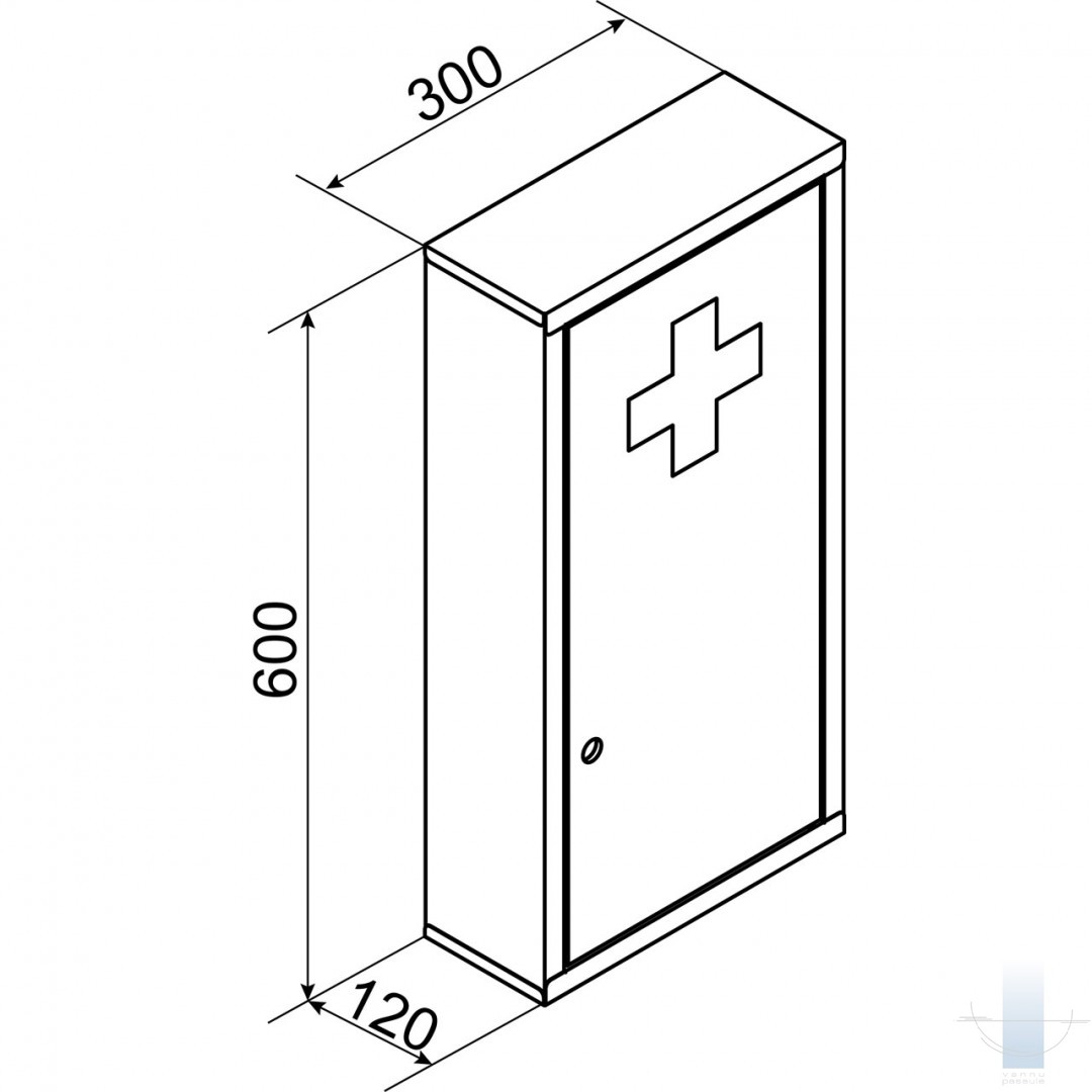 Zāļu skapis ar pelēku rāmi un slēdzamām stikla durvīm ar caurspīdīgu stikla krustu. Pretrūsas apstrādāts pulvera pārklājums. Slēdzene ir standarta tipa un nav klasificēta ar drošību.