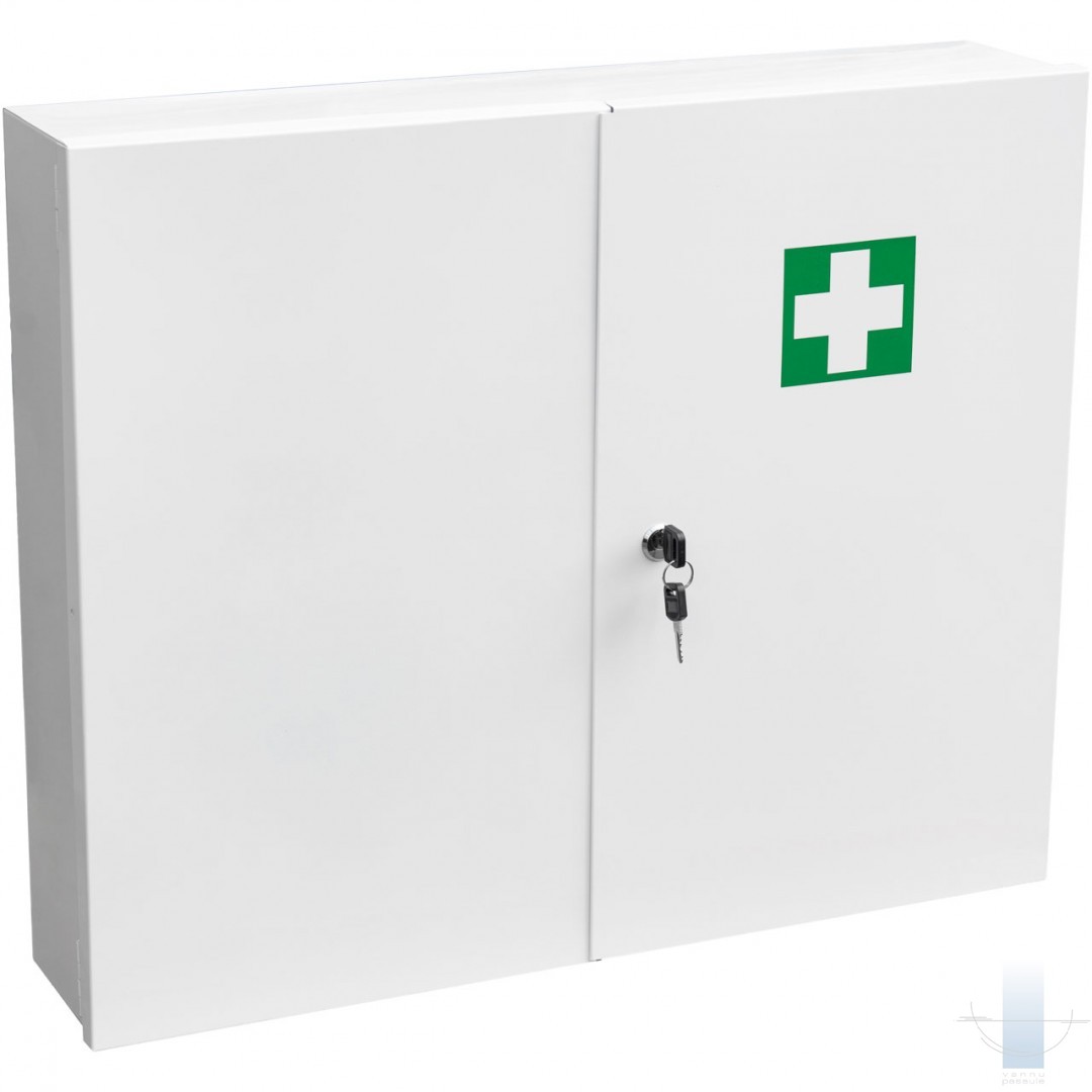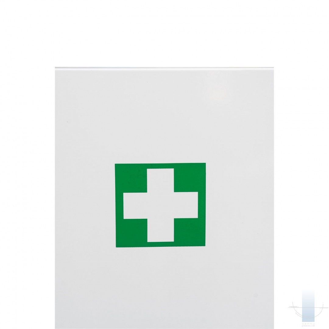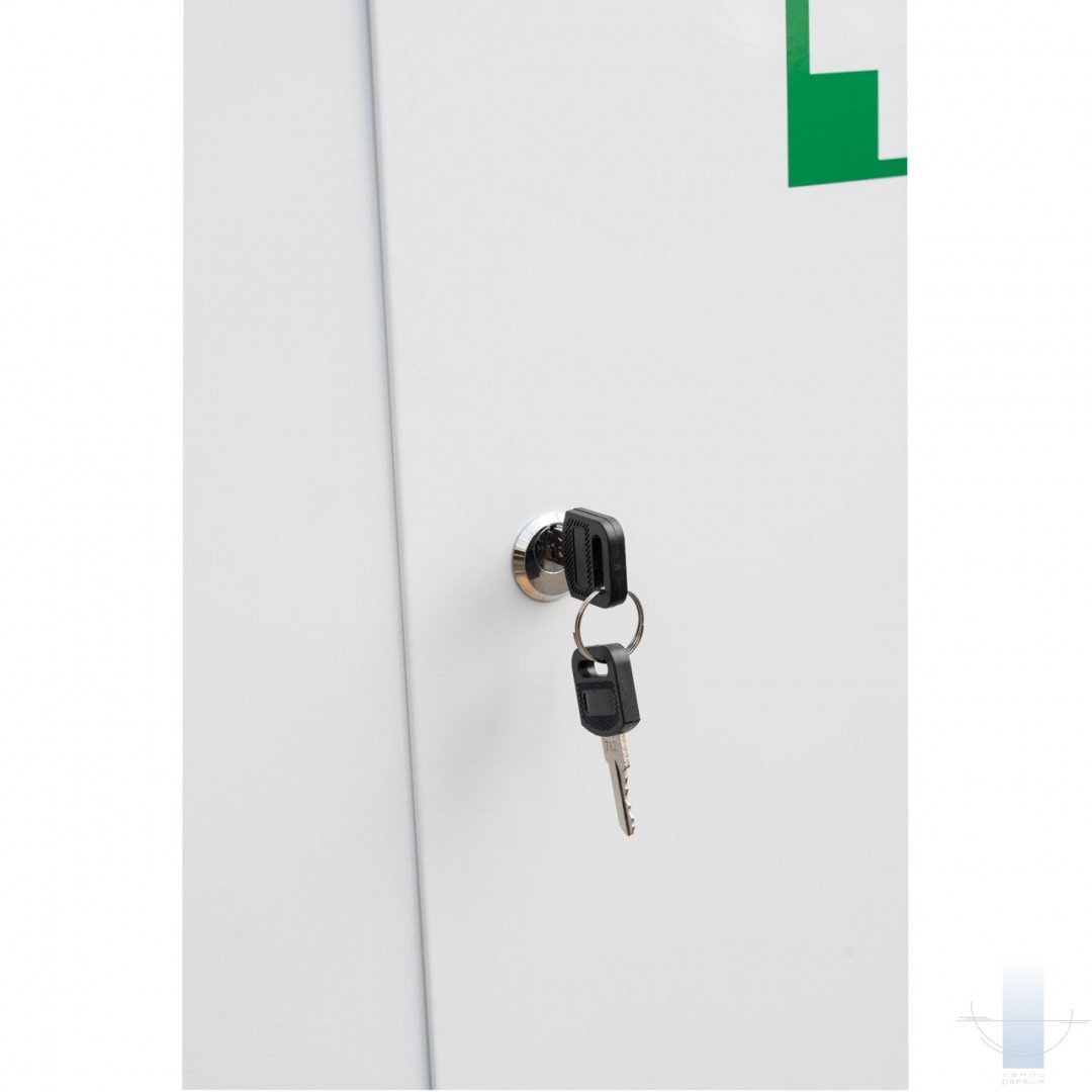 Liels zāļu skapis no balta lakota tērauda ar zaļu krustu uz vienām durvīm. Plaša uzglabāšanas vieta ar vairākiem plauktiem. Pretrūsas apstrādāts pulvera pārklājums. Ar aizslēdzamām ārdurvīm un aizslēdzamu iekšējo skapi. Divas dažādas atslēgas katrai slēdzenei. Katrai slēdzenei ir iekļauta papildu atslēga. Slēdzene ir standarta tipa un nav klasificēta ar drošību.