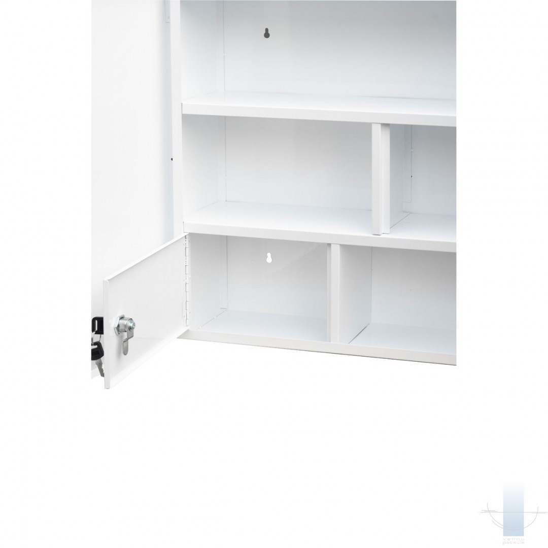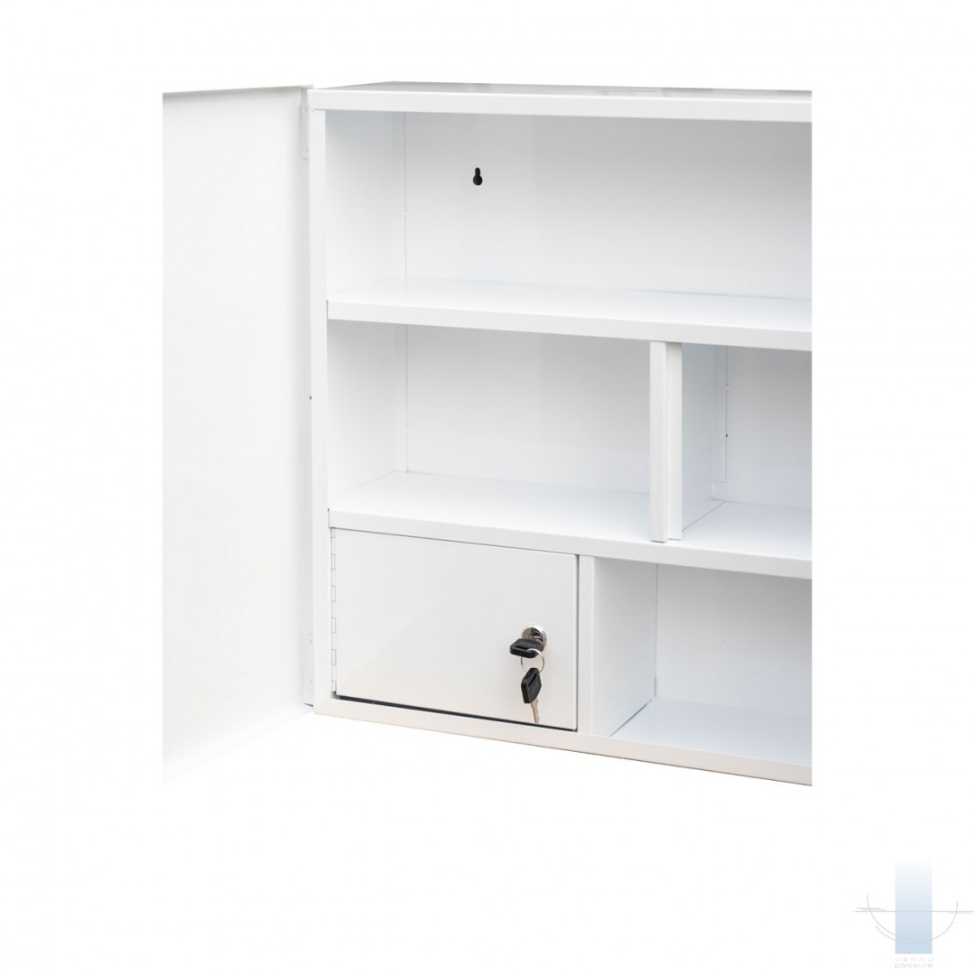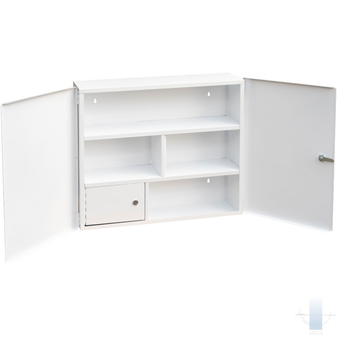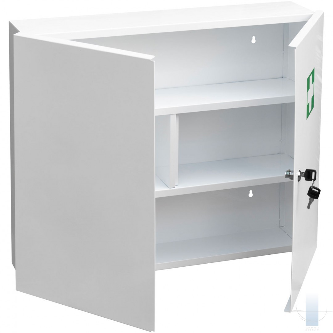 Liels zāļu skapis no balta lakota tērauda ar zaļu krustu uz vienām durvīm. Plaša uzglabāšanas vieta ar vairākiem plauktiem. Pretrūsas apstrādāts pulvera pārklājums. Ar aizslēdzamām ārdurvīm un aizslēdzamu iekšējo skapi. Divas dažādas atslēgas katrai slēdzenei. Katrai slēdzenei ir iekļauta papildu atslēga. Slēdzene ir standarta tipa un nav klasificēta ar drošību.