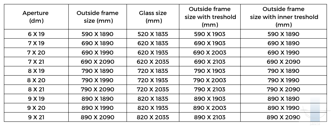 Saunas durvis tiek izgatavotas no 8 mm rūdīta stikla. Durvju komplektācija iespējama ar dažādu veidu tonētiem stikliem: pelēks, bronza. Saunas durvju kārba izgatavota no līmētas lapu koka koksnes. Saunas durvīm izmanto speciāli stikla vērtnēm paredzētas firmas “Abloy” eņģes KS-6540, FL-48; firmas “Abloy” fiksators “Abloy-4238”. Saunas durvīm ir kārbas blīvējums – karstumizturīgs silikons.