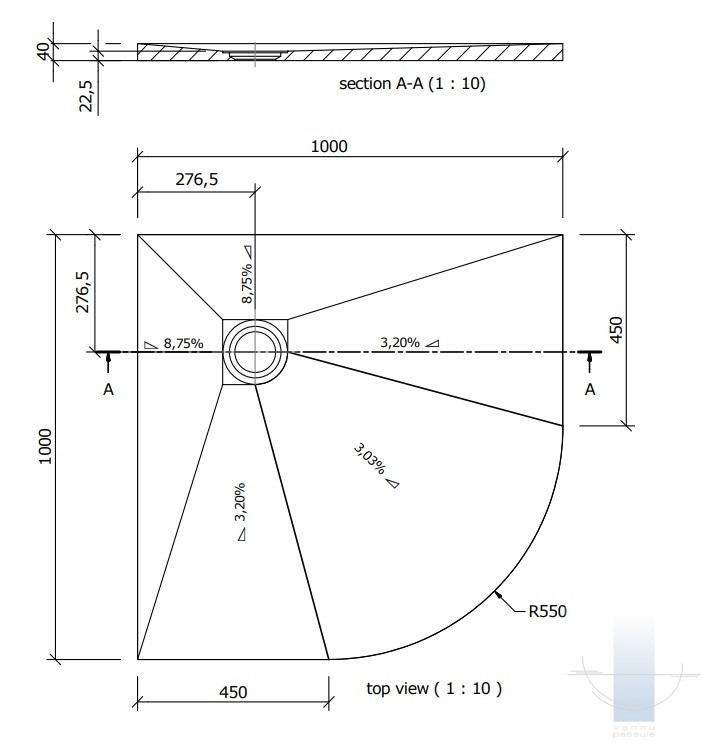 Virsmas kritums (no Fundo grīdas elementa ārējās malas līdz drenāžas atveres ārējai malai):