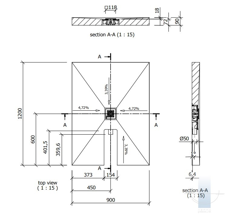 Fundo Integro komplekts ar izvadu centrā un pieslēgumu īsajā malā 120x90 cm DN50