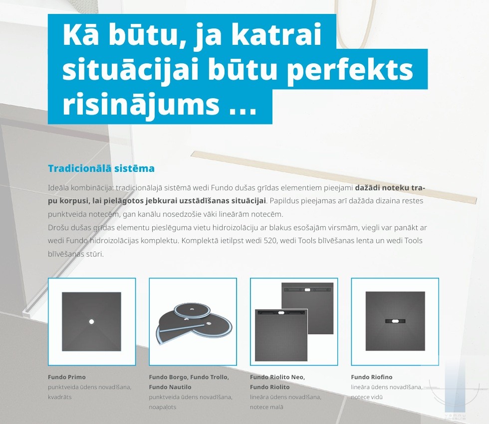 Kvadrātveida un taisnstūra Fundo Floor elementi nodrošina plašu dušas zonu un ir īpaši praktiski un uzticami, pateicoties vienmērīgajam, rūpnīcā integrētajam slīpumam un 100% ūdensnecaurlaidīgai sistēmai. Tie piedāvā jaunas dizaina iespējas vannas istabām un mitrajām telpām, kā arī nodrošina vienkāršu un drošu uzstādīšanu.
