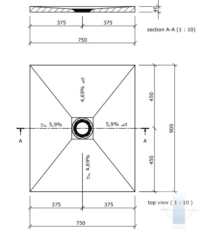 Virsmas slīpums (no Fundo dušas elementa ārējās malas līdz notekas atveres ārējai malai): 18 mm