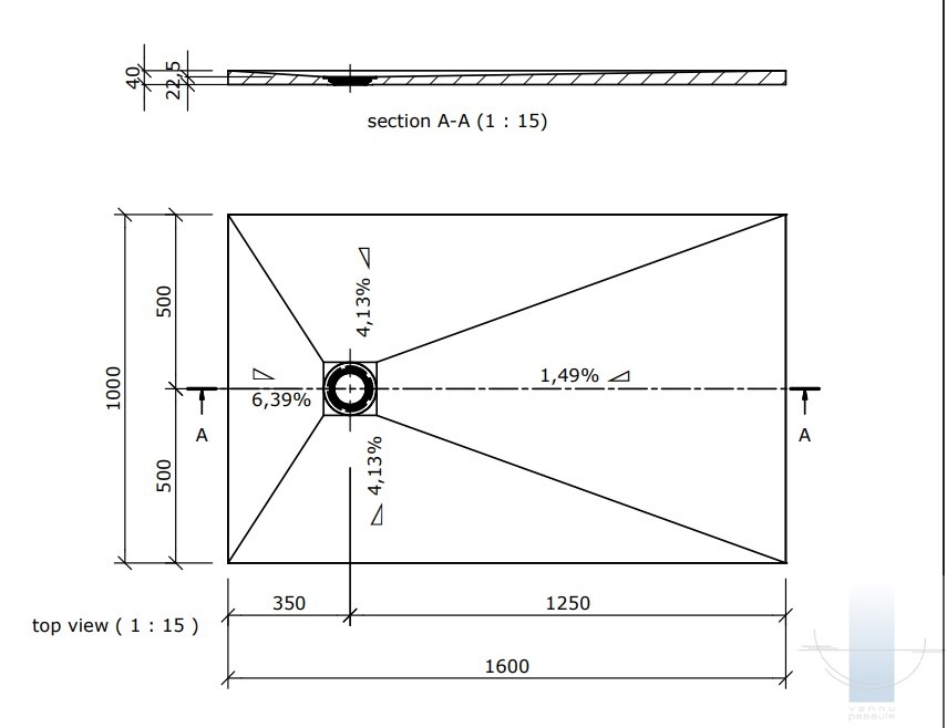 Virsmas slīpums (no Fundo dušas elementa ārējās malas līdz notekas atveres ārējai malai): 18 mm