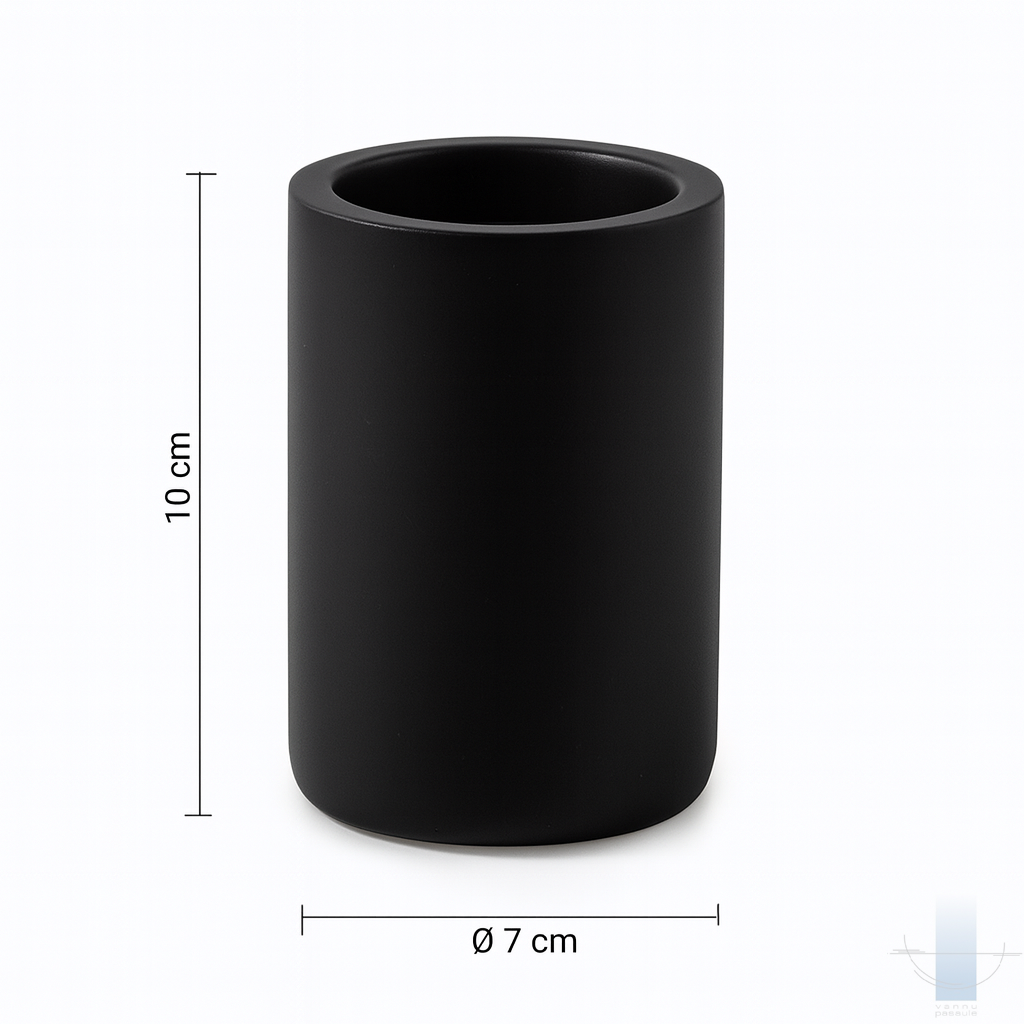 Izgatavota no izturīga poliresīna, glāze ir viegla, stabila un piemērota ikdienas lietošanai. Matētā melnā apdare piešķir īpaši stilīgu izskatu un harmoniski saskan ar citiem melniem vai kontrastējošiem vannas istabas elementiem.