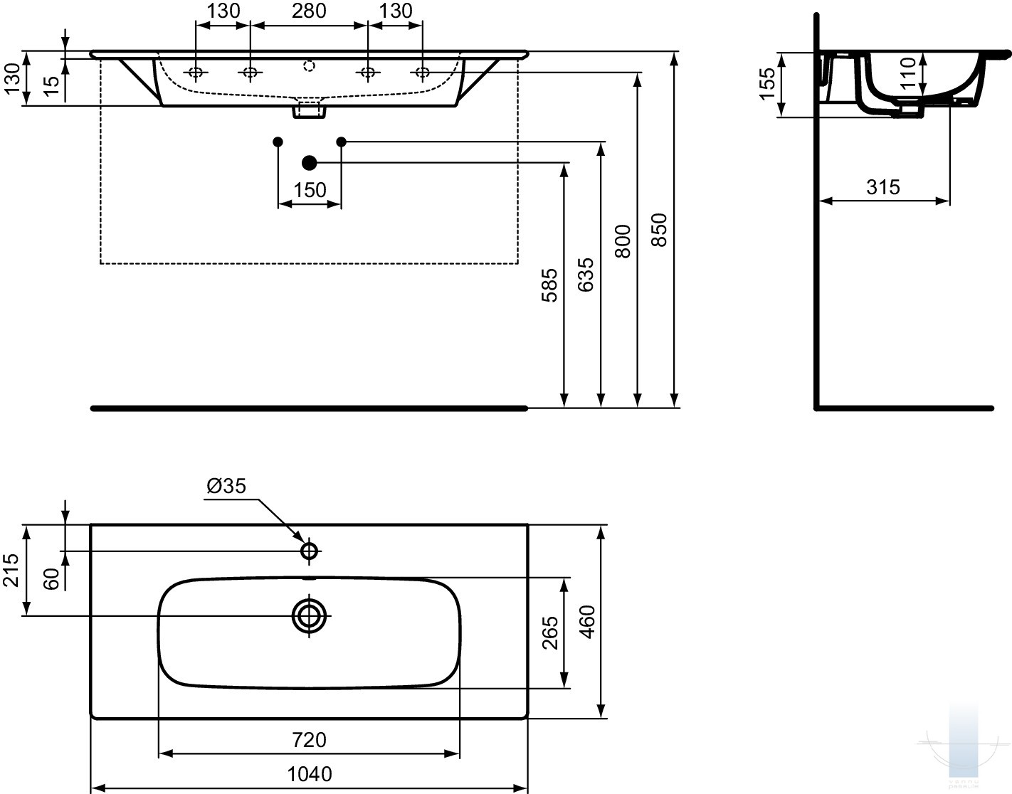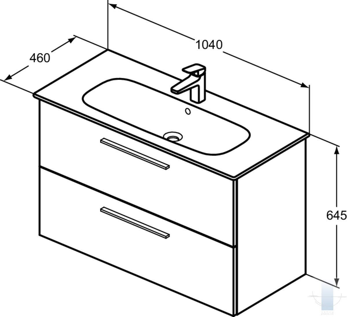 Ideal Standard i.life A izlietne mēbelei, 104 cm (1040 x 460 x 155), ar caurumu maisītājam un pārplūdi, balta keramika