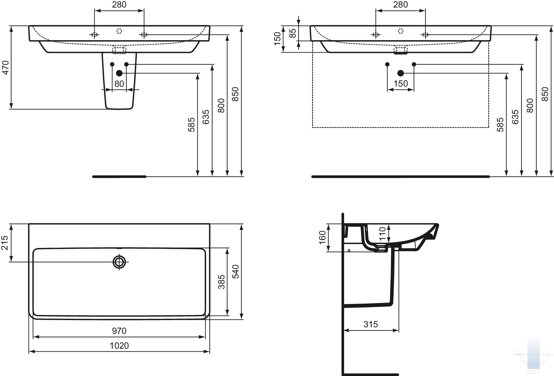 Ideal Standard - I.Life.B izlietne ar pārplūdes/ bez maisītāja caurumu 102 cm, Balta