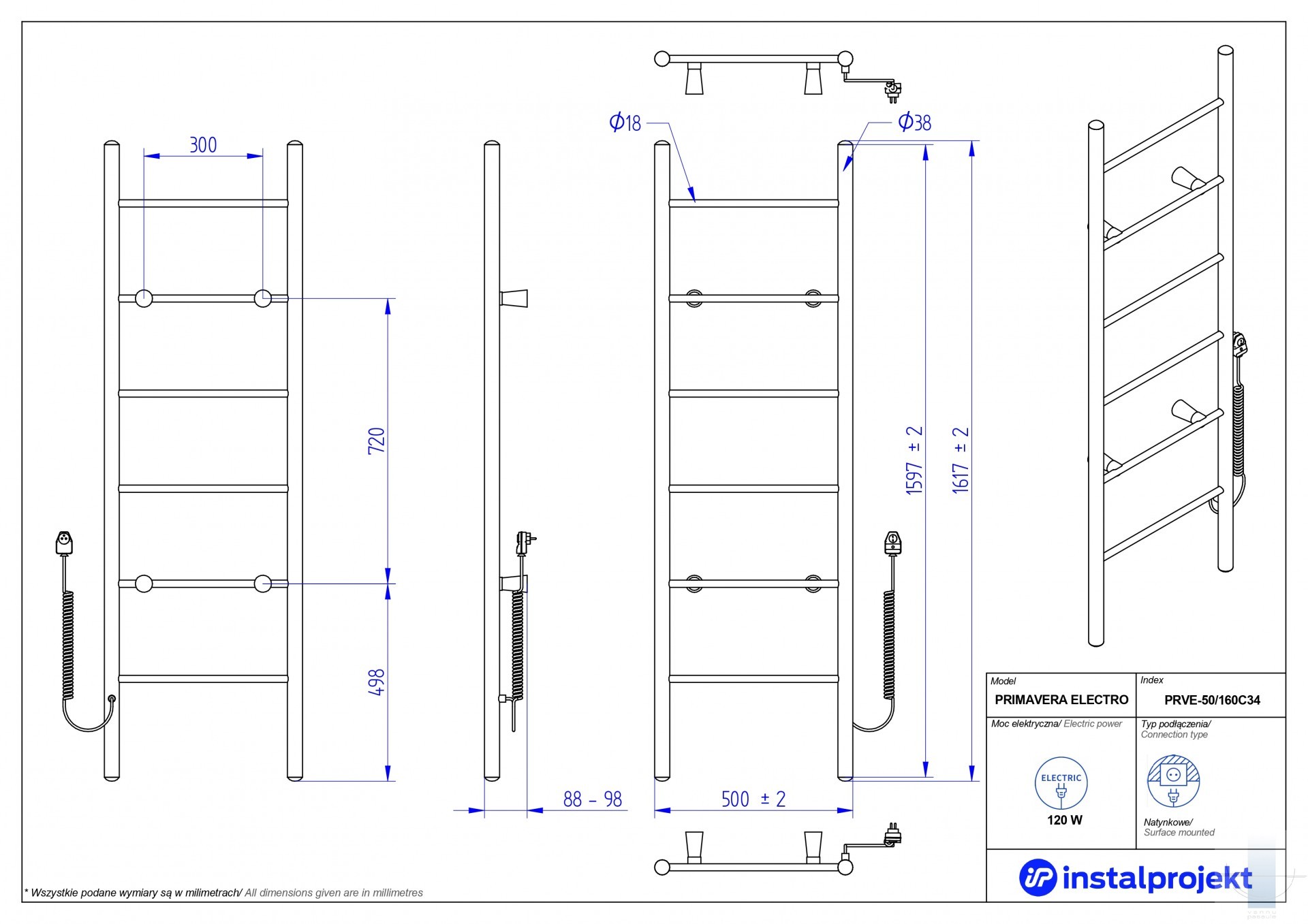 Instal Projekt Elektriskais dvieļu žāvētājs Primavera 50/160, Melns matēts