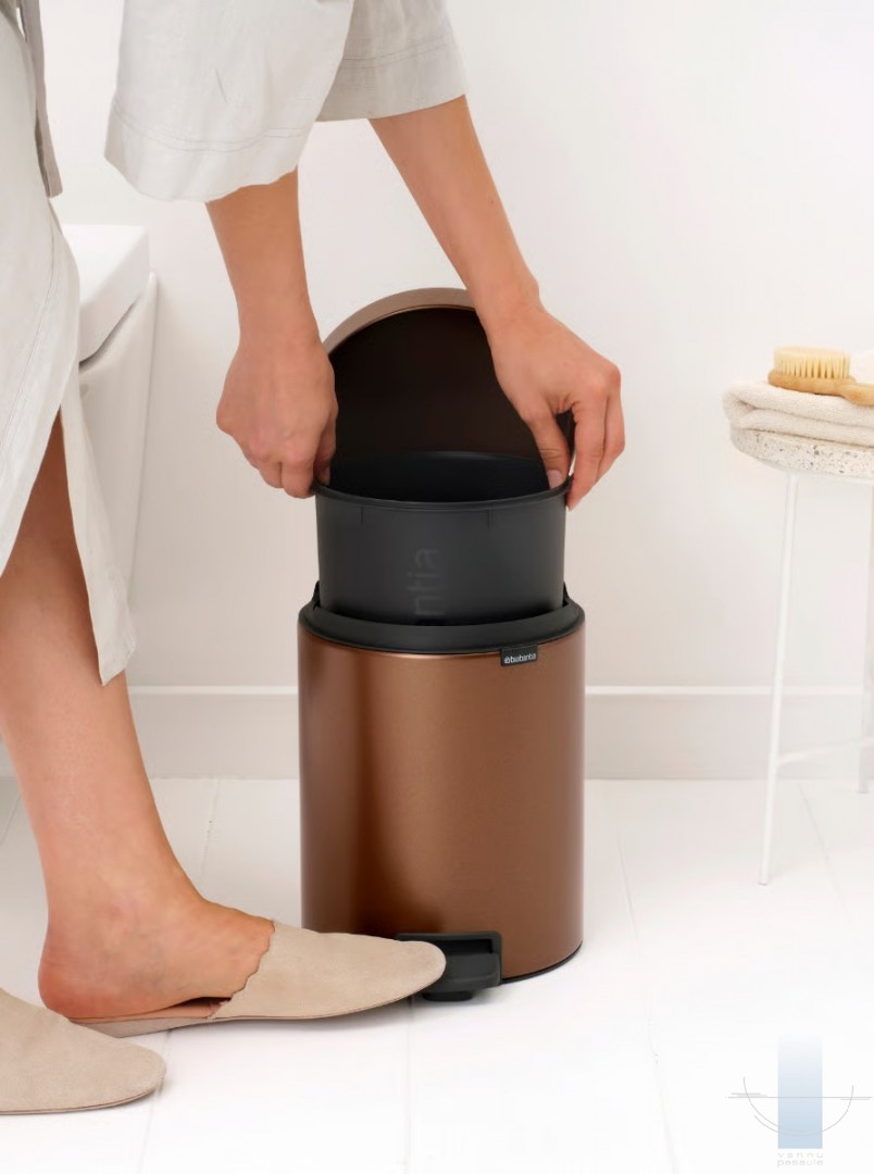 Brabantia atkritumu tvertne ar pedāli NewIcon 5 litri ir ne tikai stilīga un higiēniska, bet arī uzticama. Izturīga un vienmēr stingri turas, pateicoties neslīdošajai pamatnei un pretapgāšanās blokam. Vāks ir necaurlaidīgs pret smakām, aizveras klusi un atveras pie vieglākā kājas pieskāriena. Neliels mūžīga dizaina pieskāriens jūsu vannas istabai, tualetei vai bērnistabai - vai jebkurai citai telpai, kur noderētu lieliska maza atkritumu tvertne!