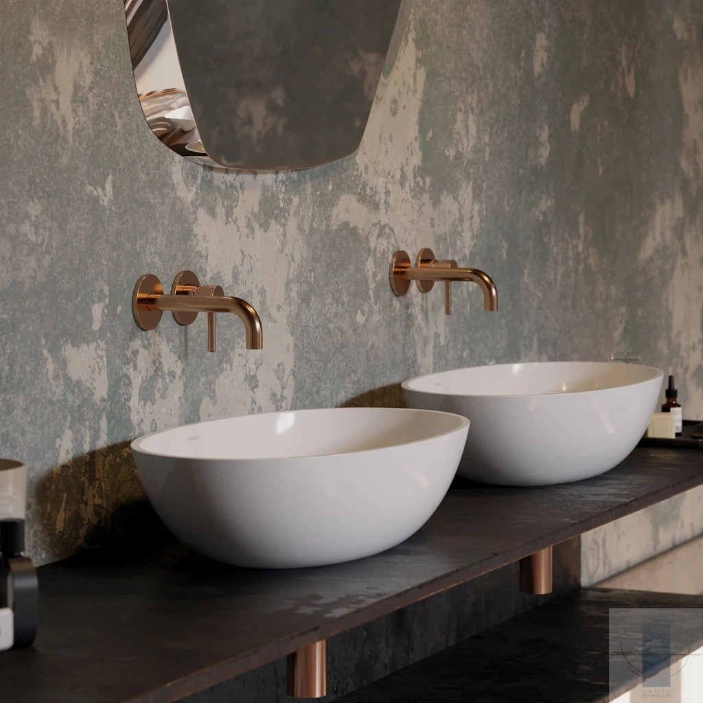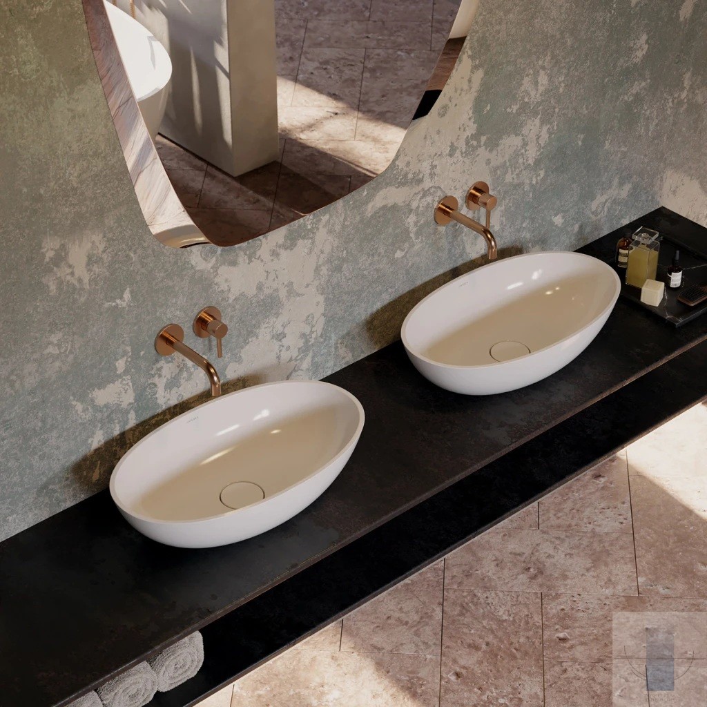 Uzliekamā izlietne no OMNIRES SHELL M+ kolekcijas izceļas ar mūsdienīgu eliptisku formu, kas maigi sašaurinās virzienā uz pamatni. Izlietnes minimālistiskais korpuss rada viegluma, taču vienlaikus arī stabilitātes iespaidu, atgādinot no klints izcirstu monolītu. Pieskaņotais izplūdes vāciņš neuzkrītoši nosedz noteci, saglabājot izlietnes harmoniski veidoto kontūru.
