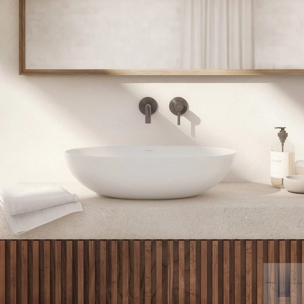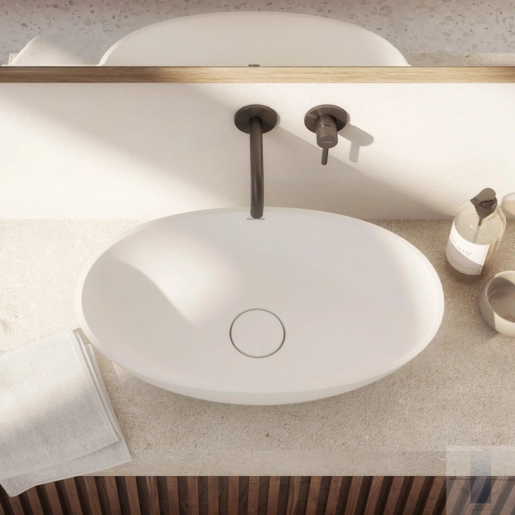 Uzliekamā izlietne no OMNIRES SHELL M+ kolekcijas izceļas ar mūsdienīgu eliptisku formu, kas maigi sašaurinās virzienā uz pamatni. Izlietnes minimālistiskais korpuss rada viegluma, taču vienlaikus arī stabilitātes iespaidu, atgādinot no klints izcirstu monolītu. Pieskaņotais izplūdes vāciņš neuzkrītoši nosedz noteci, saglabājot izlietnes harmoniski veidoto kontūru.