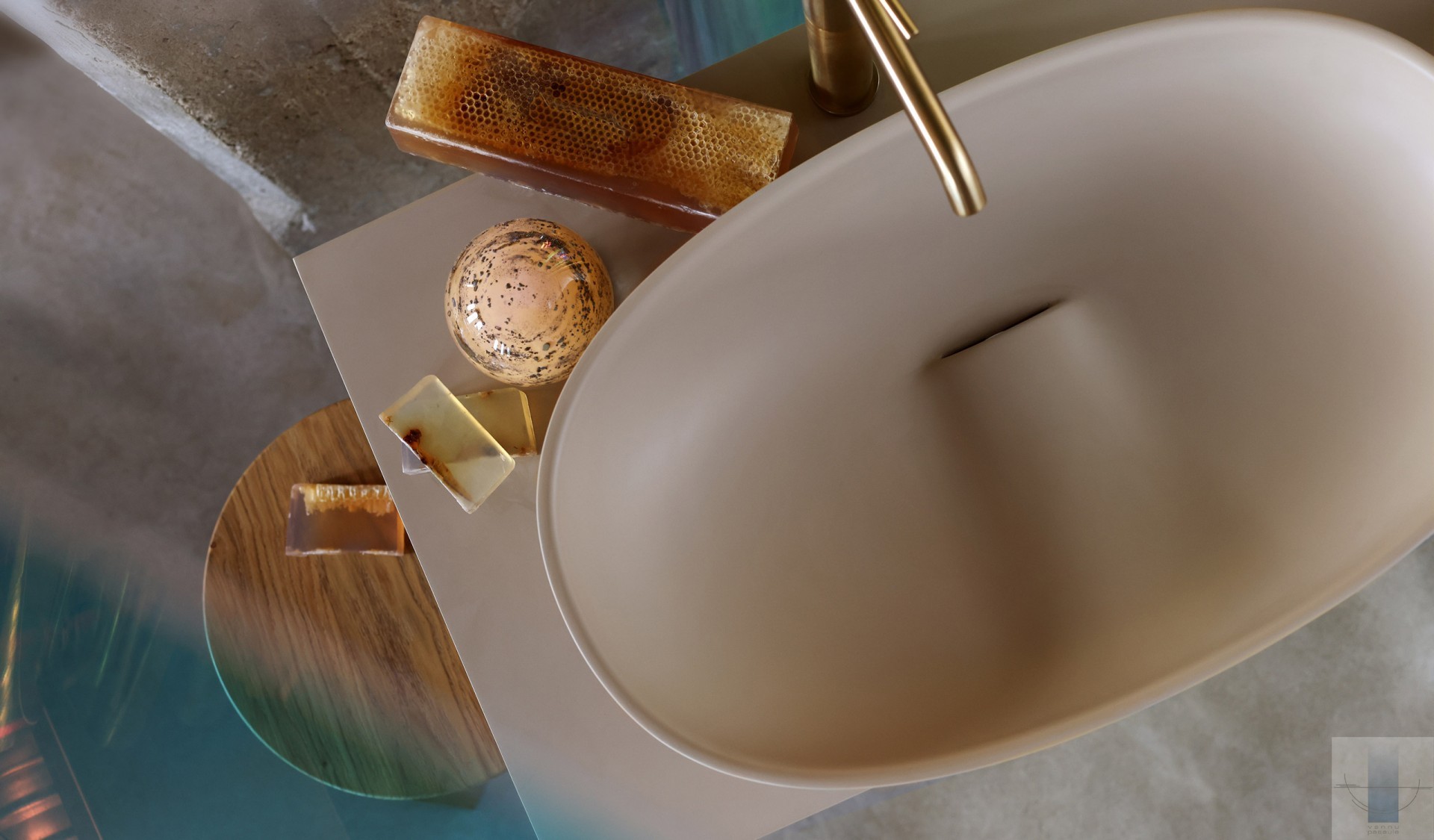 Liela, skulpurāli precīza izlietne ar innovatīvu, skatienam noslēptu ūdens noplūdi. Izgatavota no akmens masas – pamatīga un stabila materiāla ar klasiski spožu virsmu. Apstrādāta ar rokām.