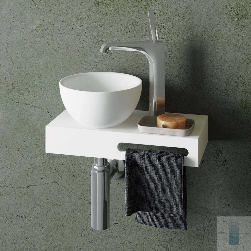 Īpaši kompakta izlietne šaurām telpām. Novietošanai uz virsmas. Izgatavota no Akmens masas – cēla un ilgmūžīga materiāla. Cieta kā akmens ar glancētu virsmu.
