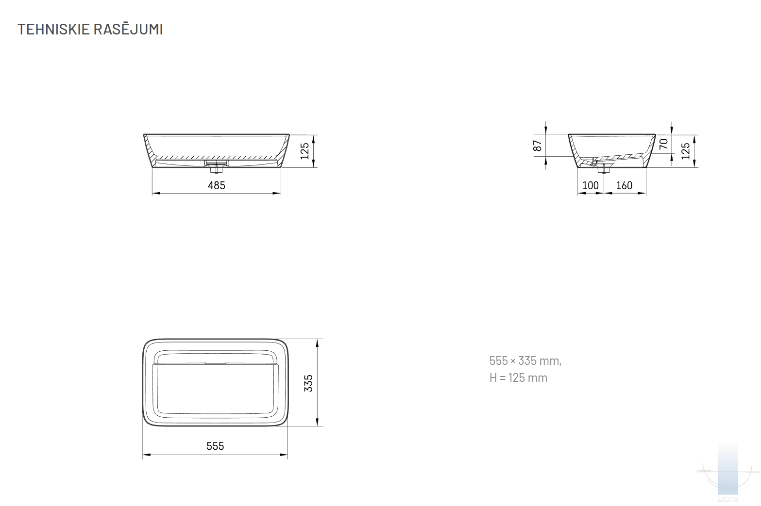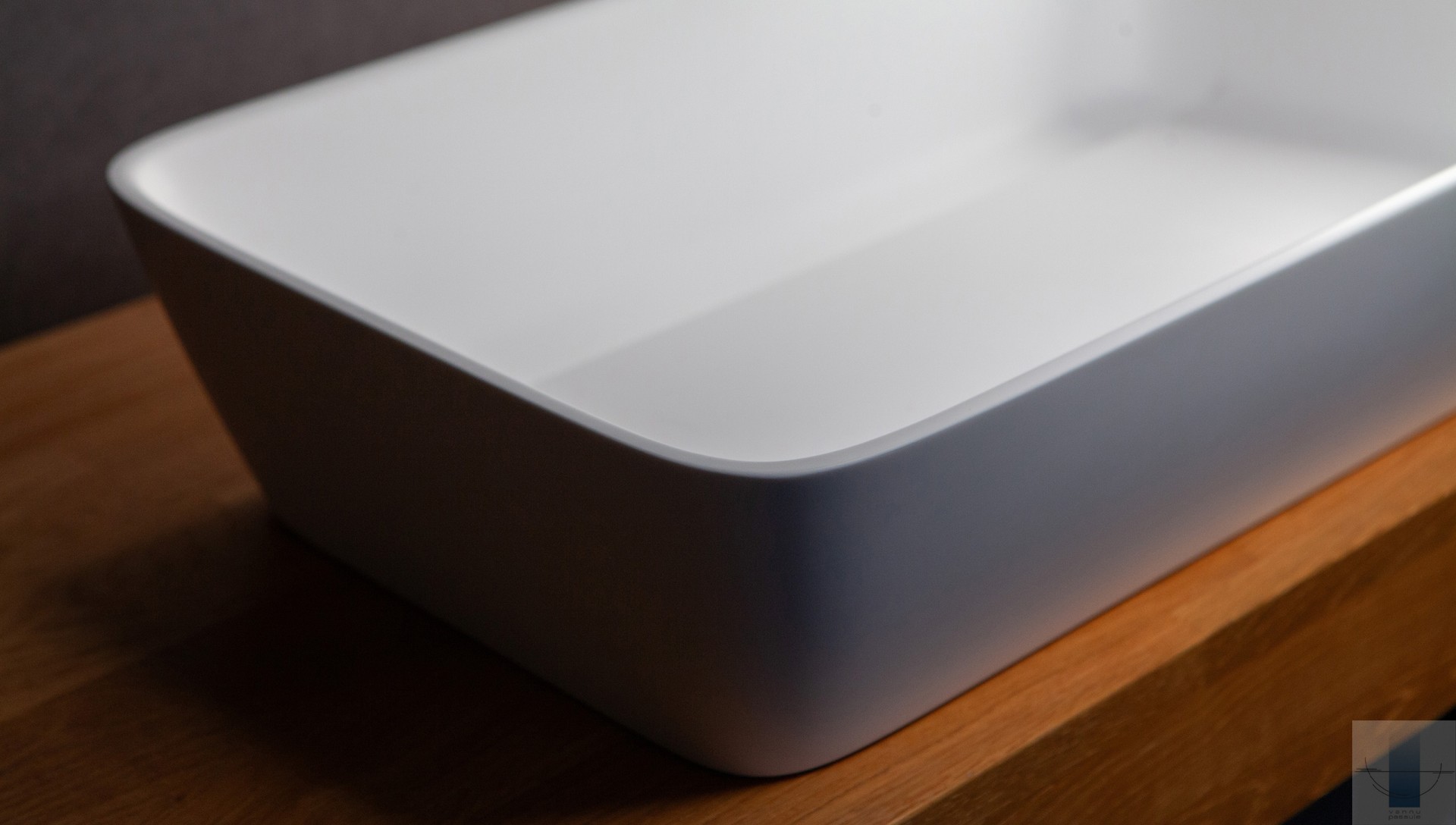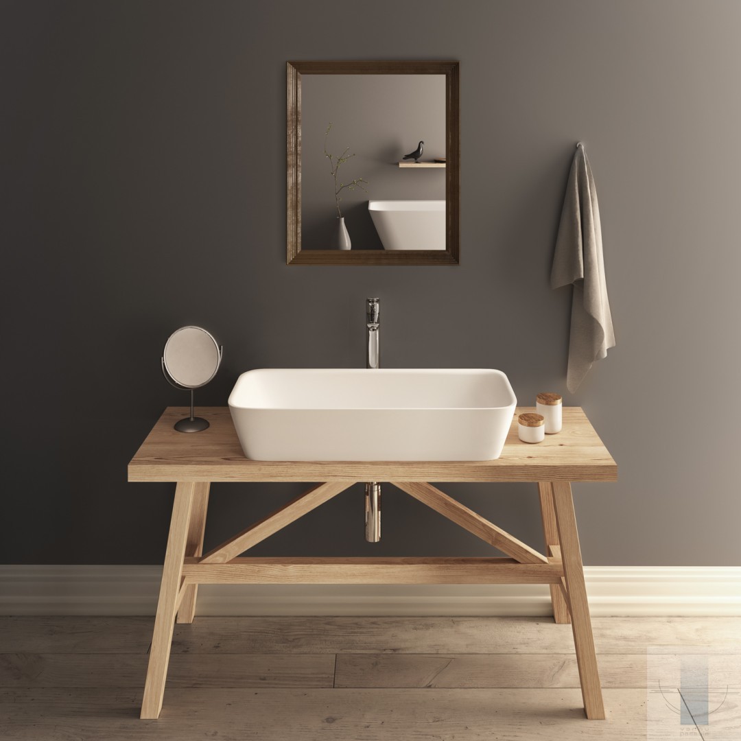 Neliela. Uz virsmas novietojama izlietne. Viegla perimetra līnija. Inovatīva, skatienam slēpta noplūde. Izgatavota no akmens masas – pamatīga un stabila materiāla ar klasiski spožu virsmu.