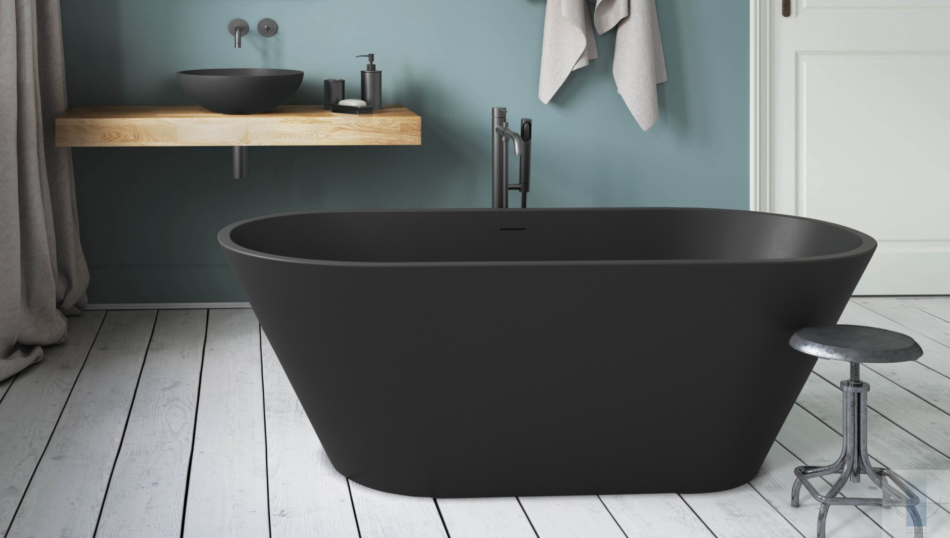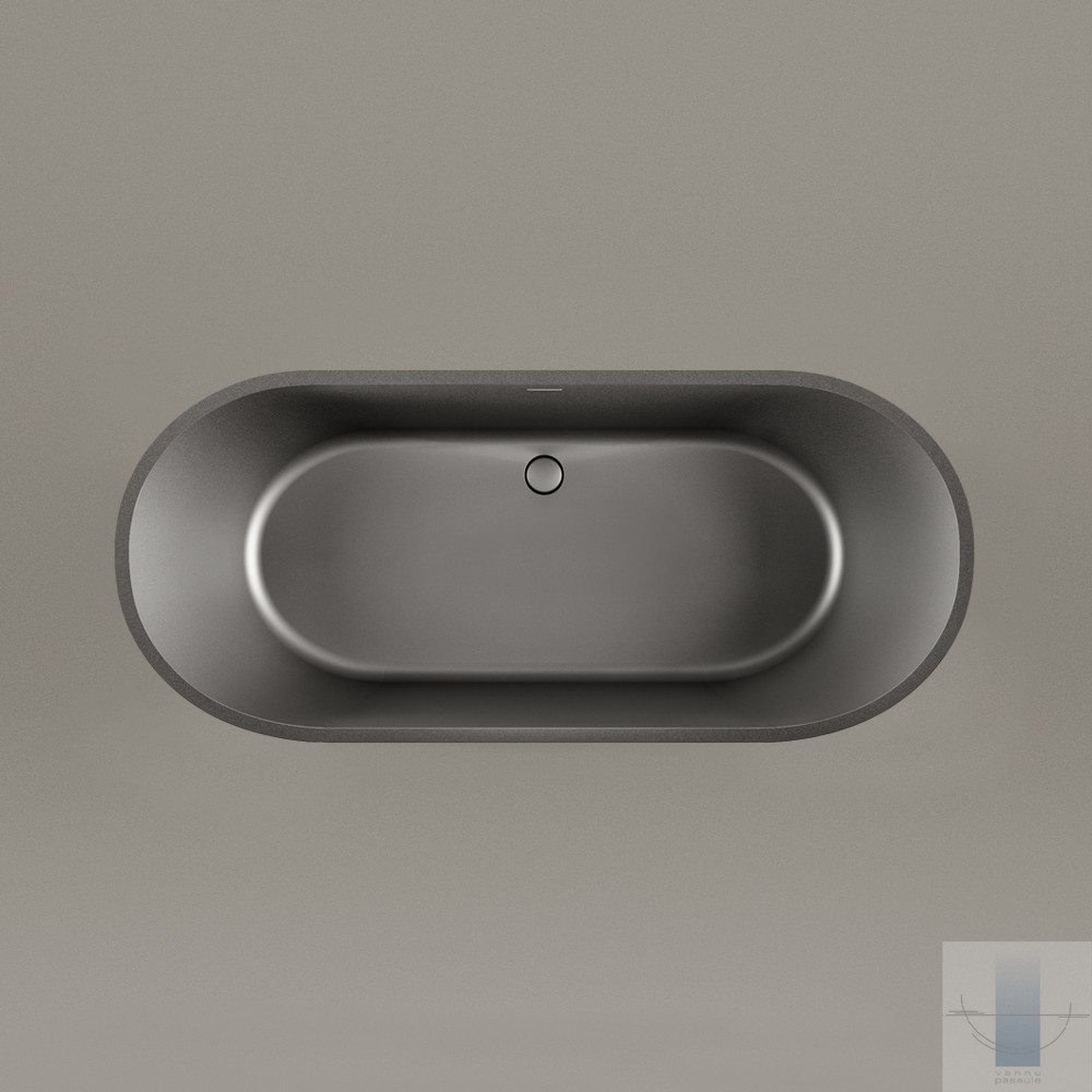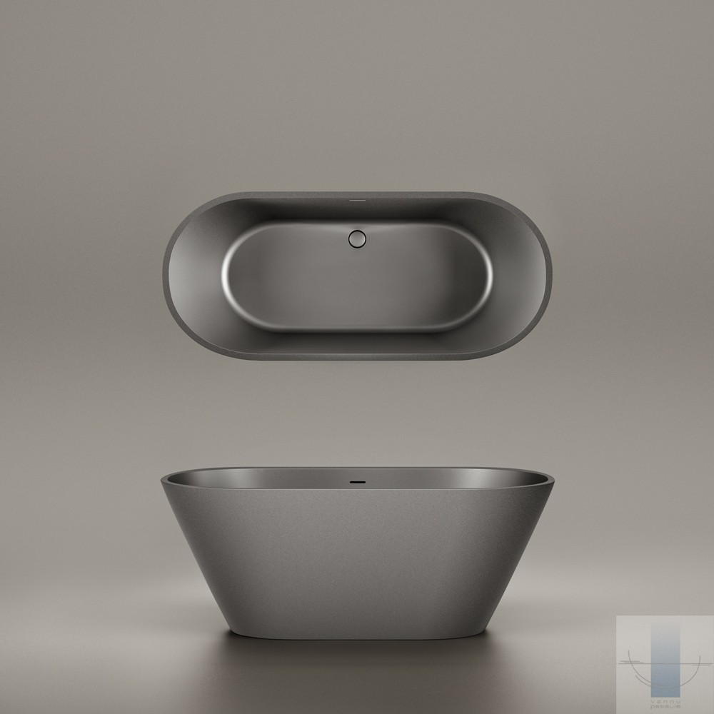 Lakoniska, ģeometriski precīza vanna. Izgatavota no Graphite – Silkstone gleznieciskākās, melnās versijas. Ar teksturētu, meistaru rokām veidotu, unikālu virsmu katram izstrādājumam.