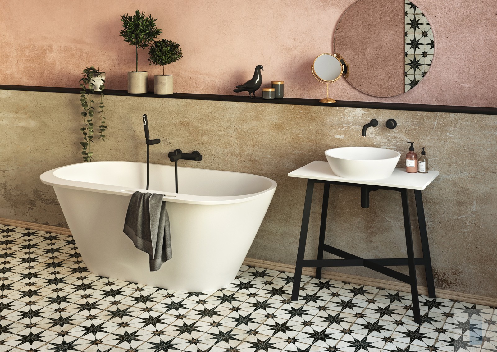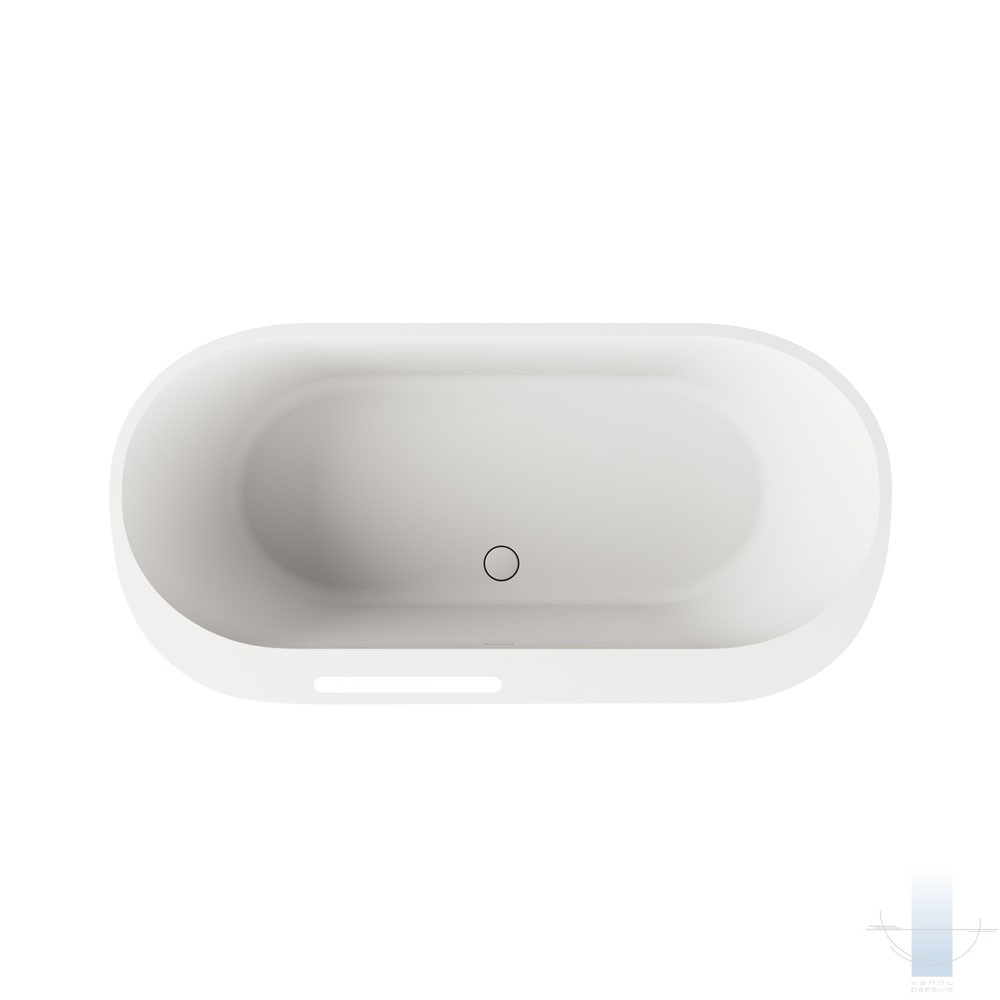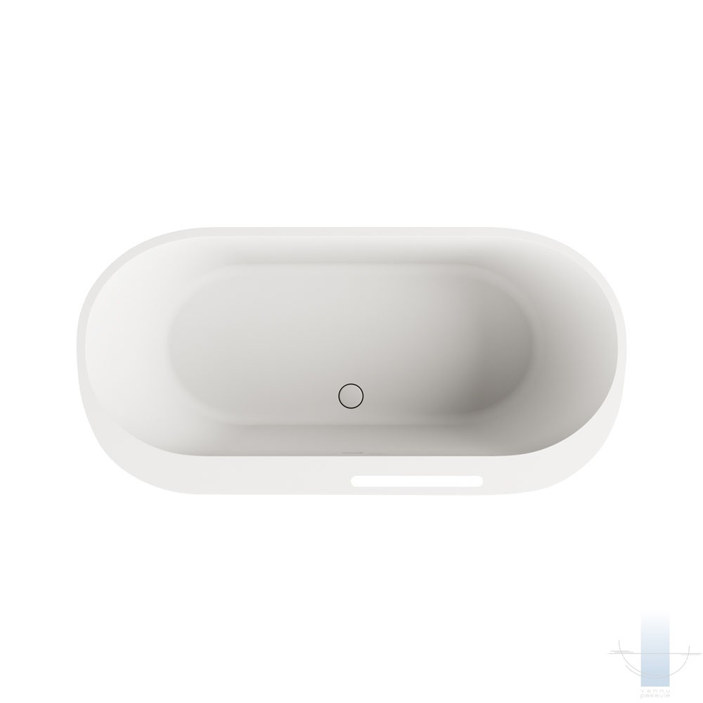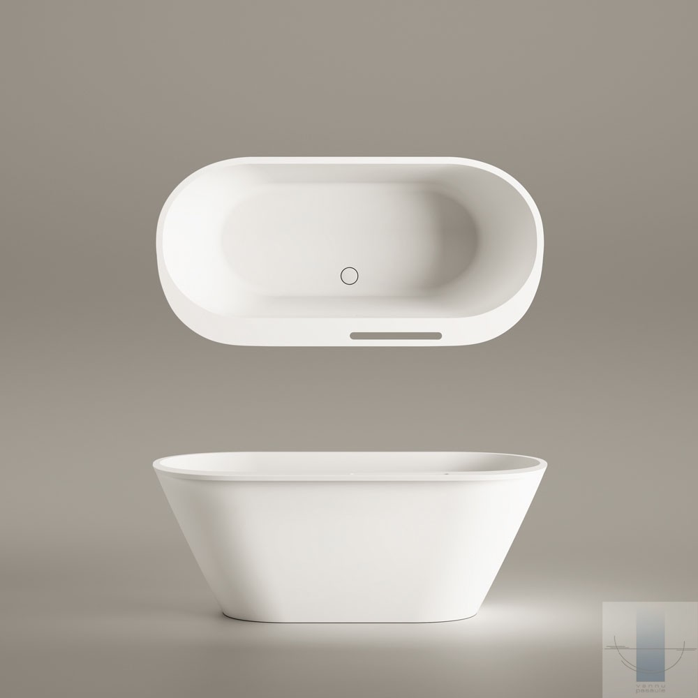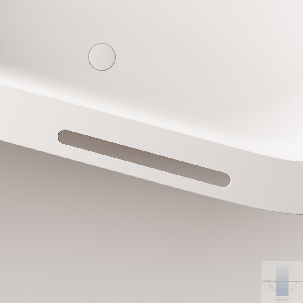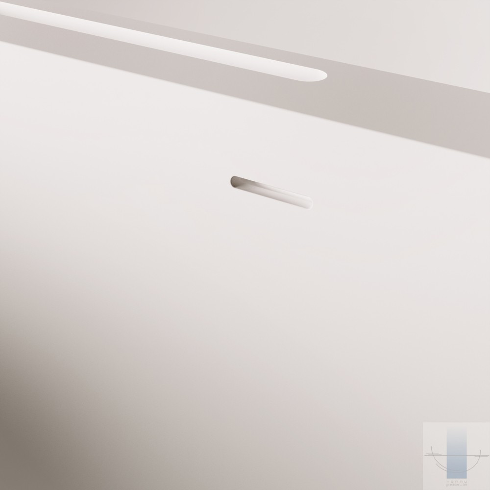 Lakoniska vanna ar plauktiņu un dvieļu turētāju. Izgatavota no Silkstone – cēla un ilgmūžīga materiāla. Cieta kā akmens ar matēti zīdainu, siltu virsmu. Apstrādāta ar rokām.
