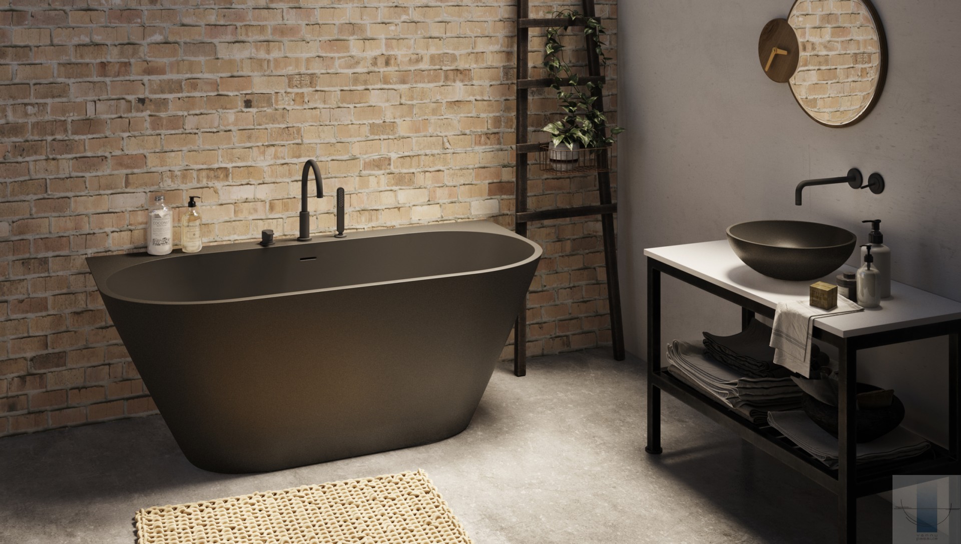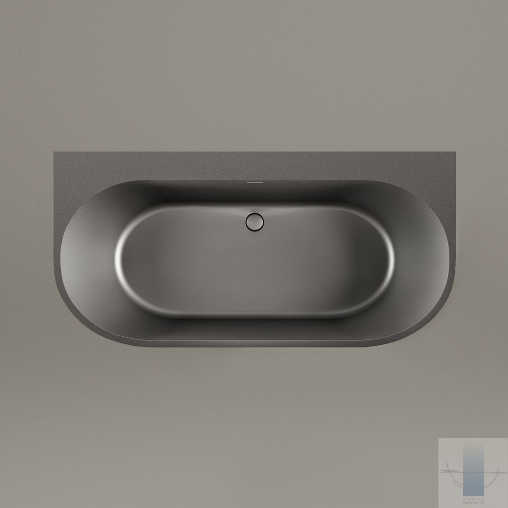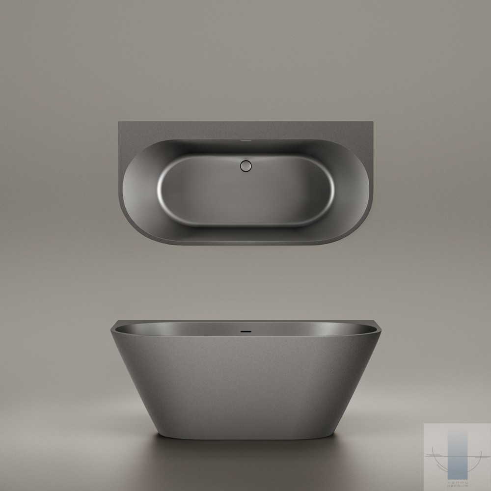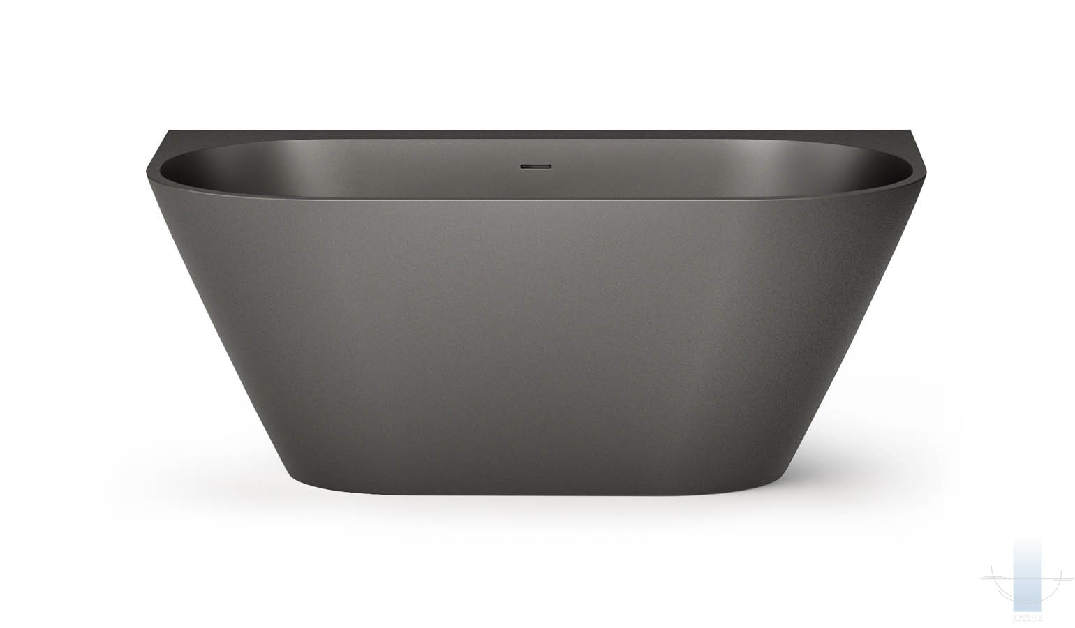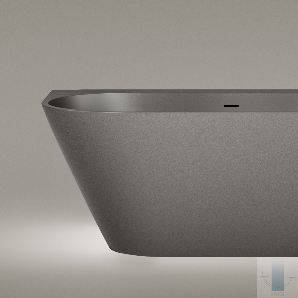 Lakoniska vanna novietošanai pie sienas. Ar plauktiņu piederumiem un jaucējkrāniem. Izgatavota no Graphite – Silkstone gleznieciskākās, melnās versijas. Ar teksturētu, meistaru rokām veidotu, unikālu virsmu katram izstrādājumam.