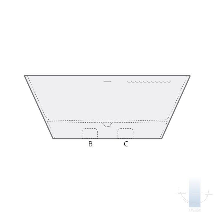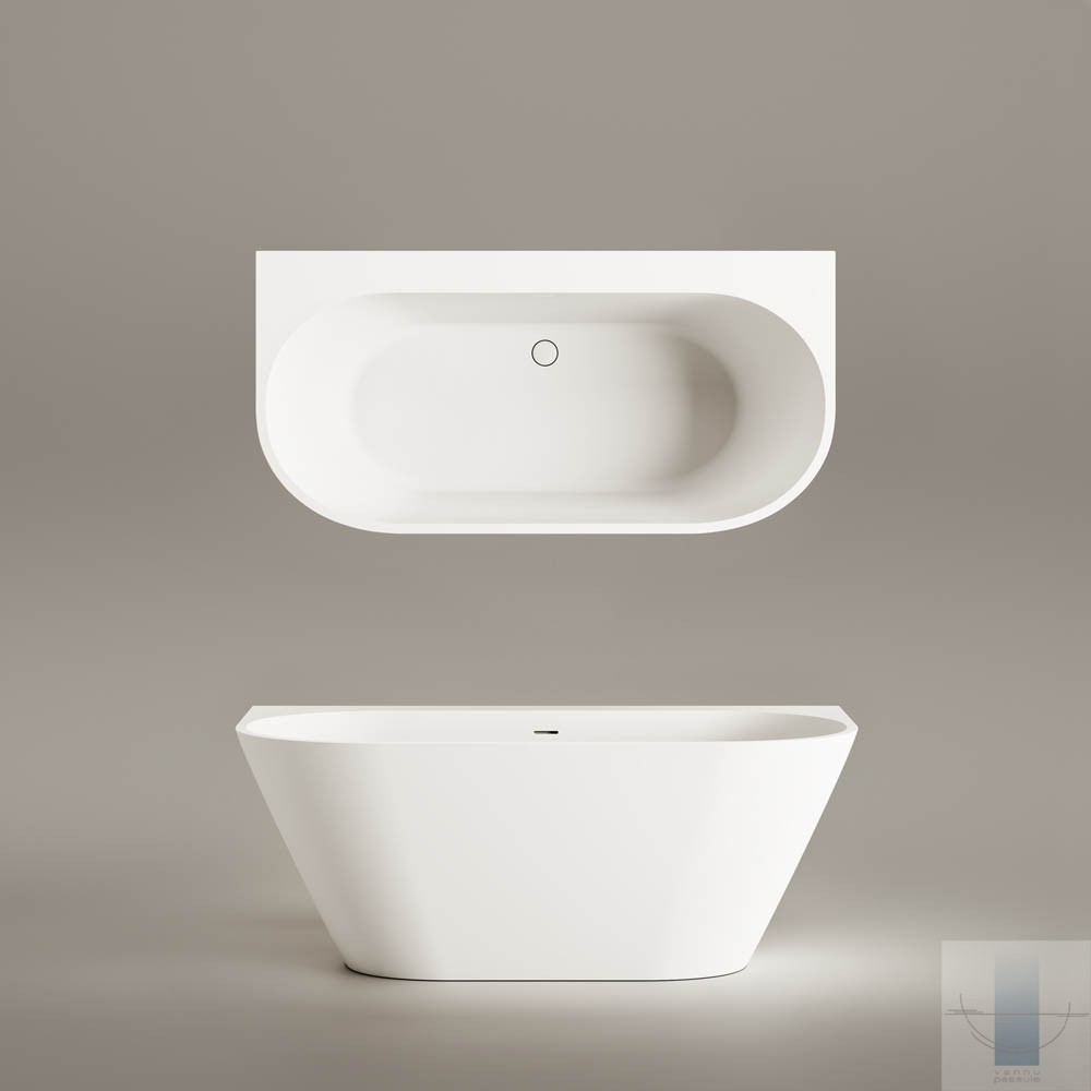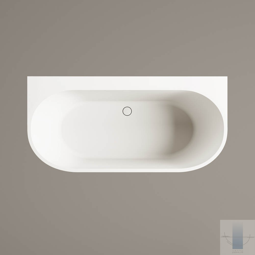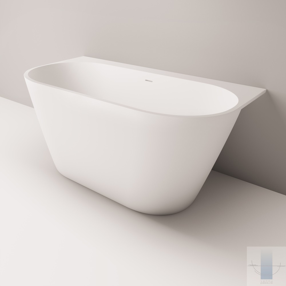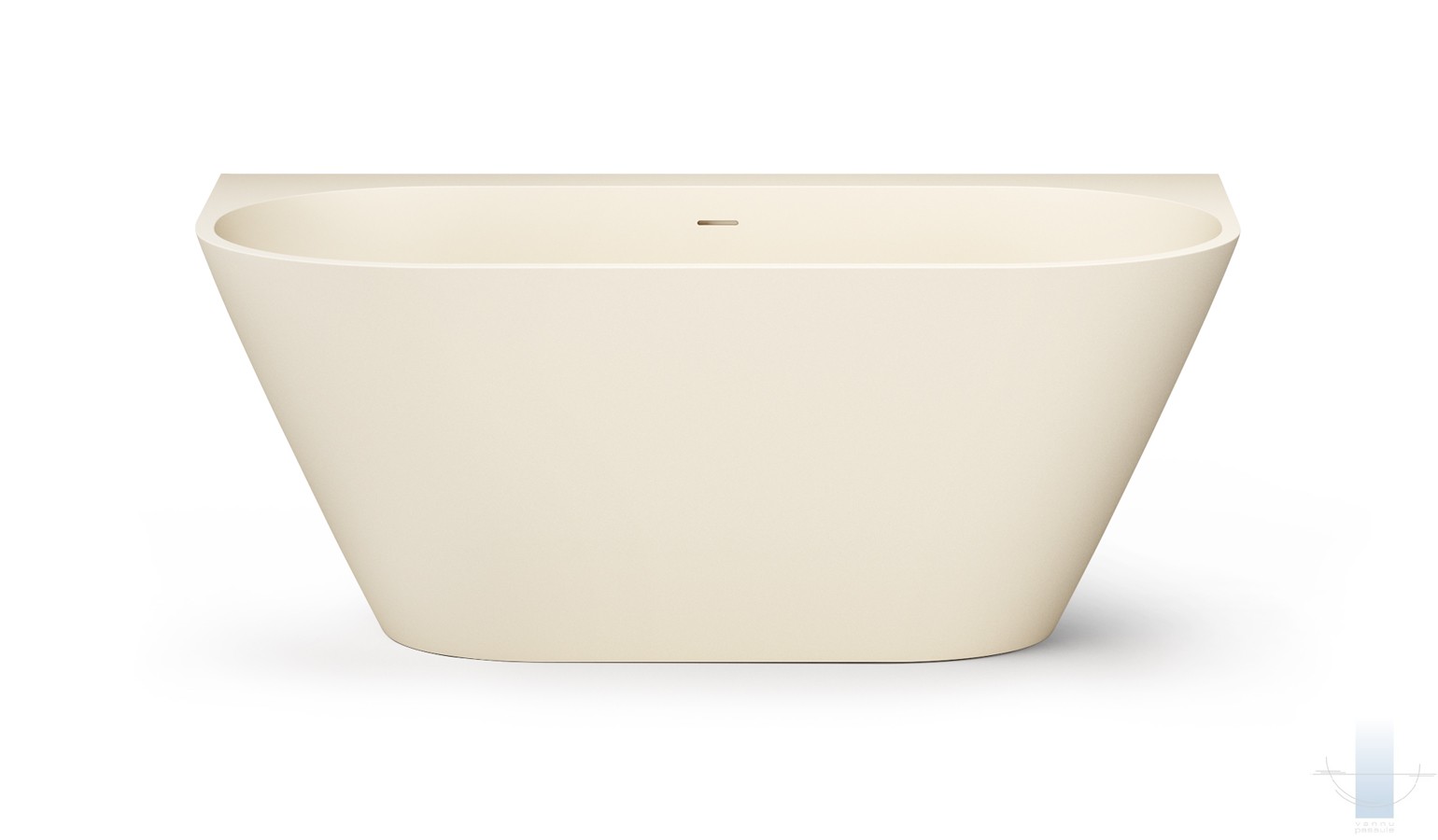 Lakoniska vanna novietošanai pie sienas. Ar plauktiņu piederumiem un jaucējkrāniem. Izgatavota no Silkstone – cēla un ilgmūžīga materiāla. Cieta kā akmens ar matēti zīdainu, siltu virsmu. Apstrādāta ar rokām.