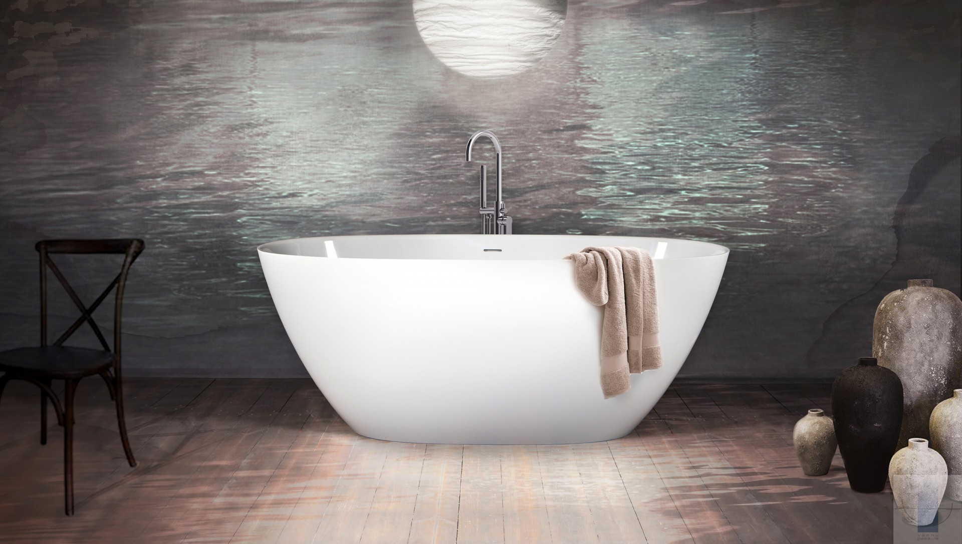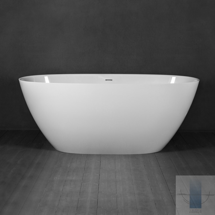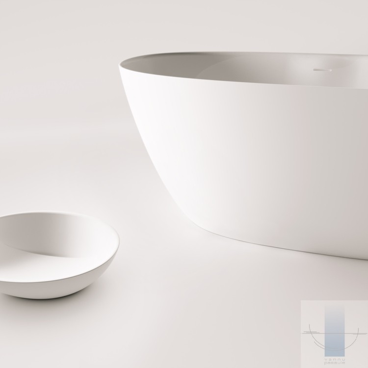 Vizuāli ieapaļa, skulpturāli smalka brīvstāvošā vanna. Izgatavota no akmens masas – pamatīga un stabila materiāla ar klasiski spožu virsmu.