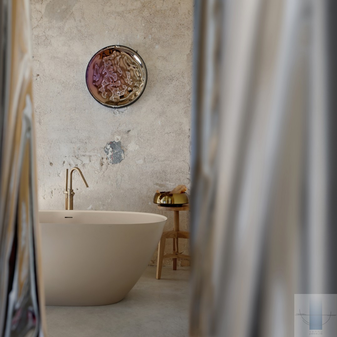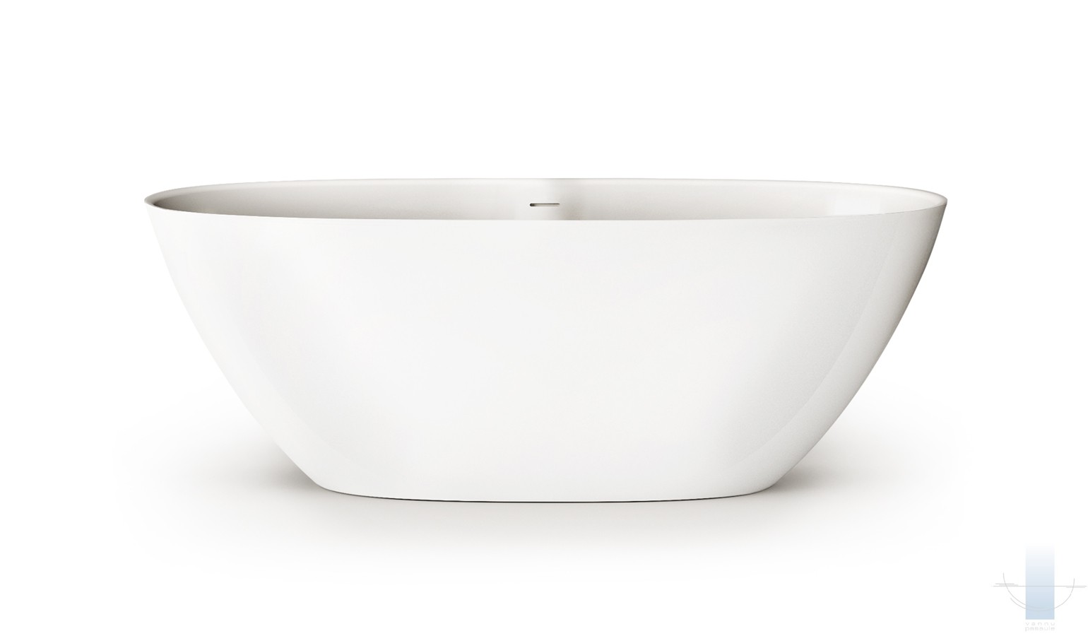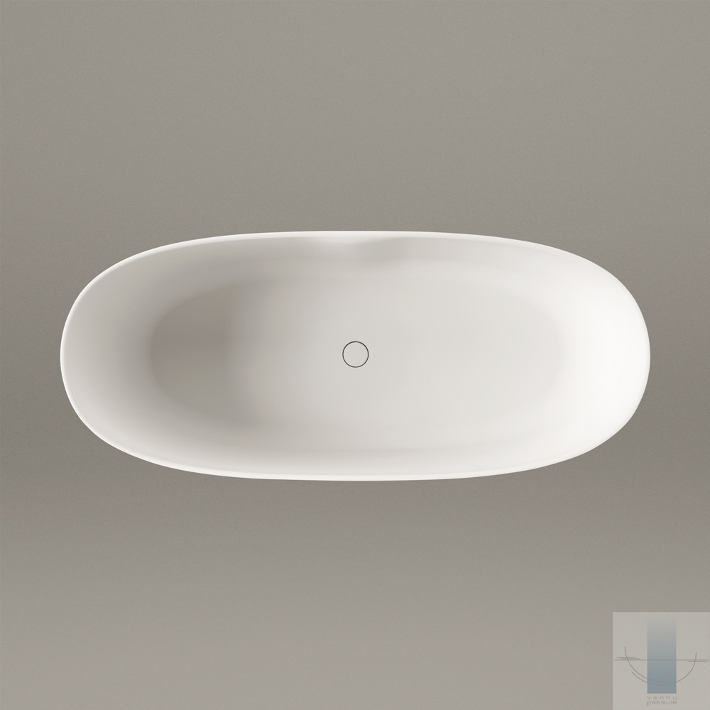 Vizuāli ieapaļa, skulpturāli smalka brīvstāvošā vanna. Izgatavota no akmens masas – pamatīga un stabila materiāla ar klasiski spožu virsmu.