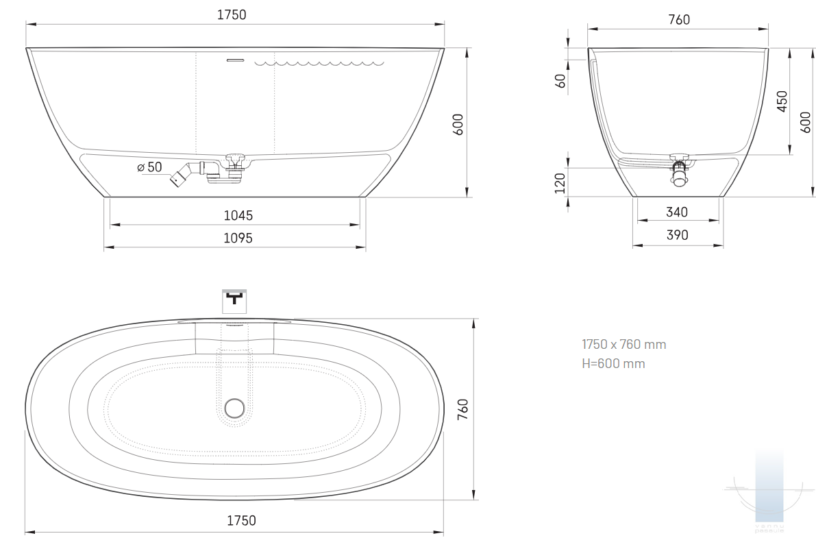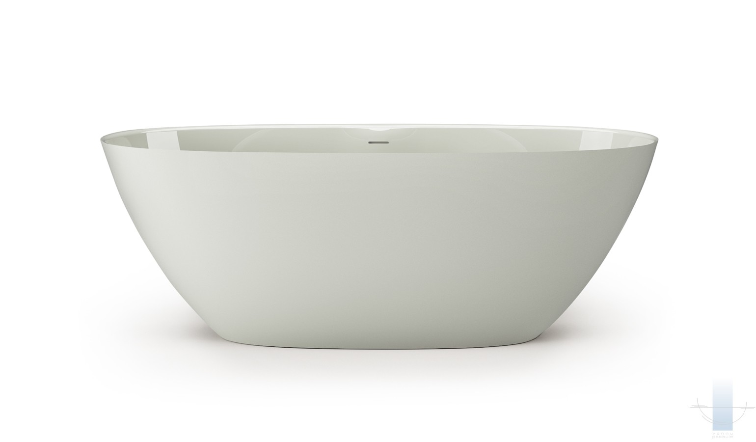 Vizuāli ieapaļa, skulpturāli smalka brīvstāvošā vanna. Izgatavota no akmens masas – pamatīga un stabila materiāla ar klasiski spožu virsmu.