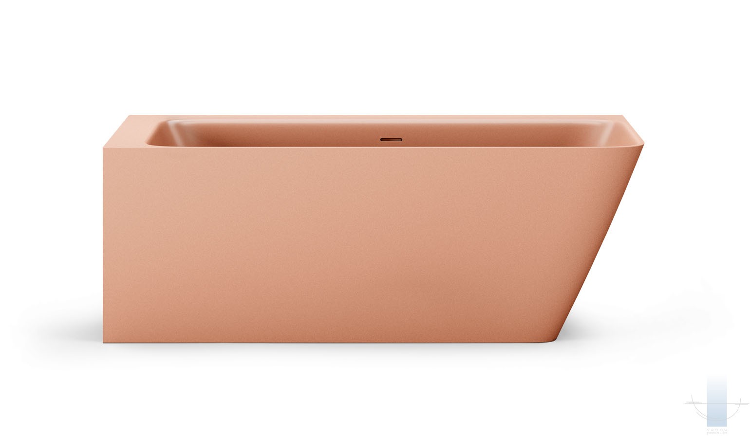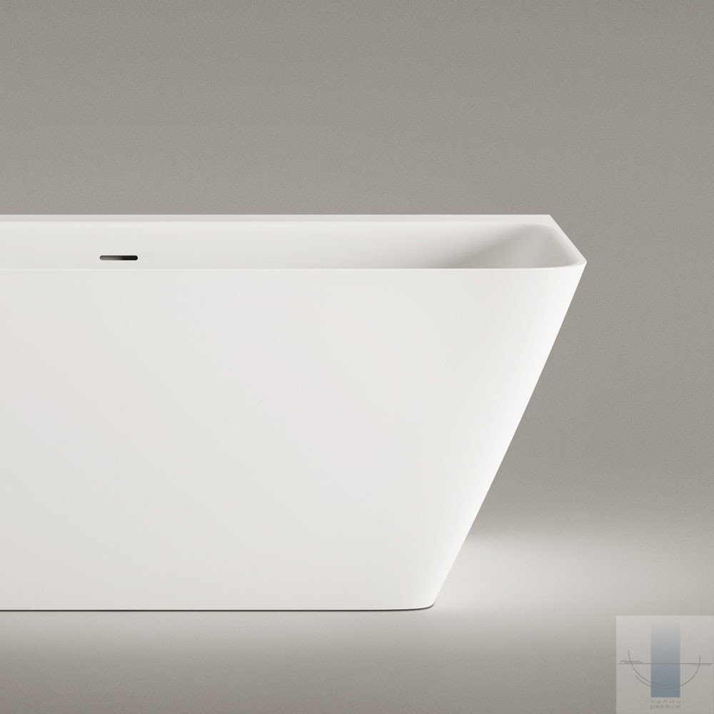 Stūra vanna, kas pilnībā piekļaujas sienām un grīdai. Viegla perimetra līnija un plauktiņš pie sienas. Paredzēta vieta jaucējkrānu montāžai. Izgatavota no akmens masas – pamatīga un stabila materiāla ar klasiski spožu virsmu.
