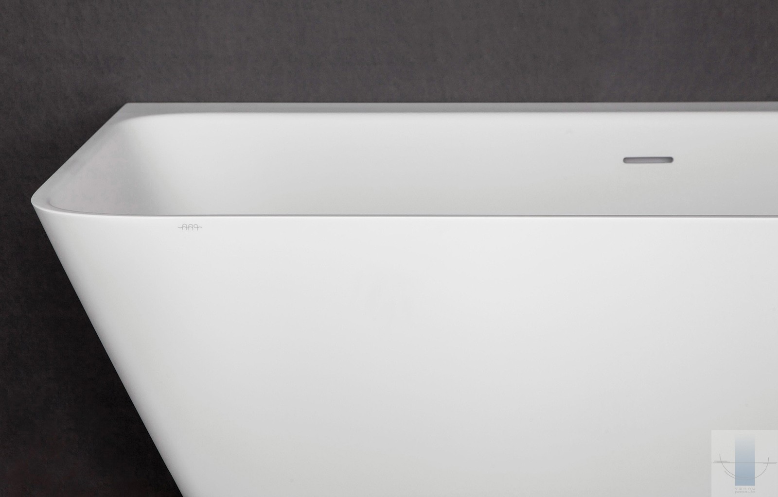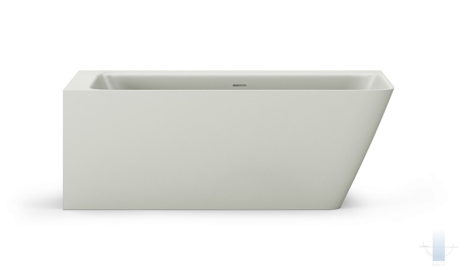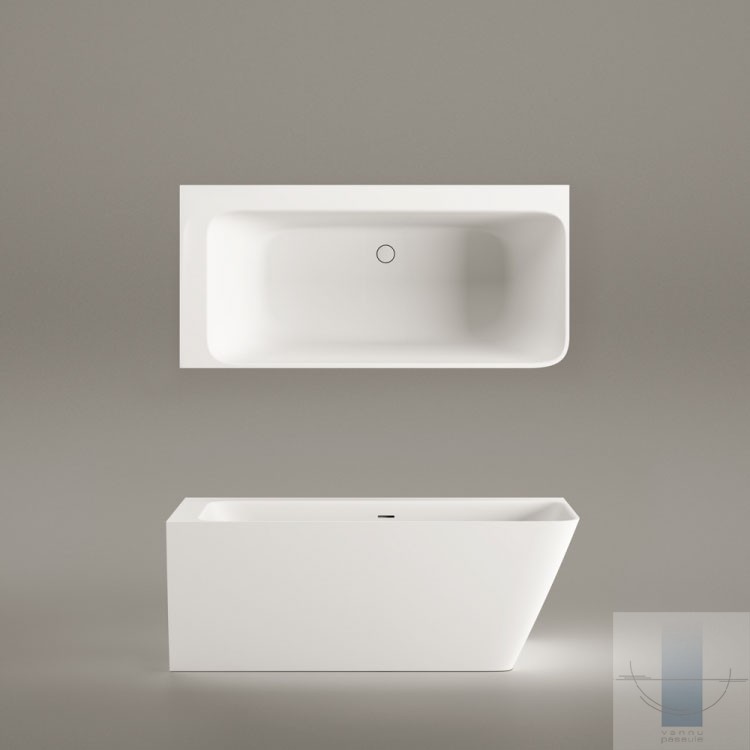 Stūra vanna, kas pilnībā piekļaujas sienām un grīdai. Viegla perimetra līnija un plauktiņš pie sienas. Paredzēta vieta jaucējkrānu montāžai. Izgatavota no akmens masas – pamatīga un stabila materiāla ar klasiski spožu virsmu.