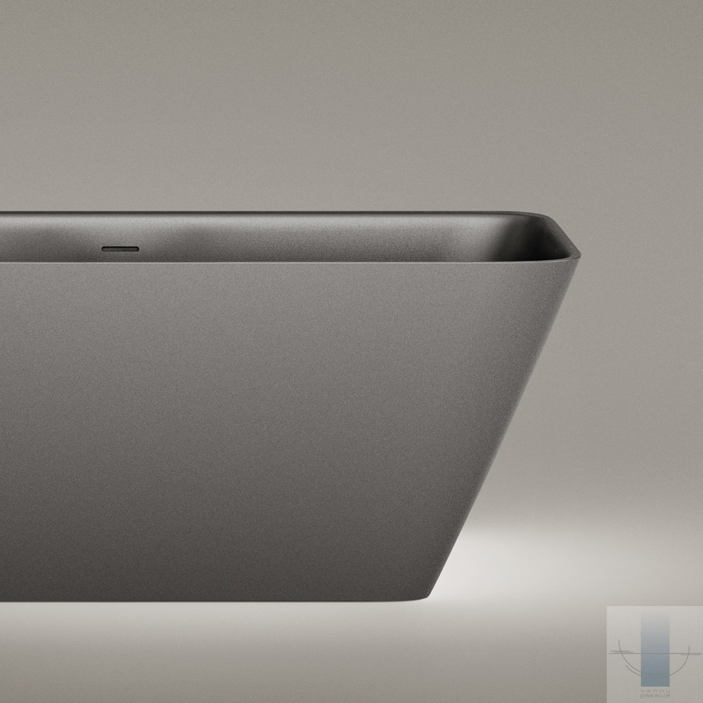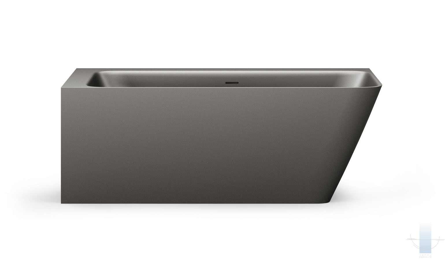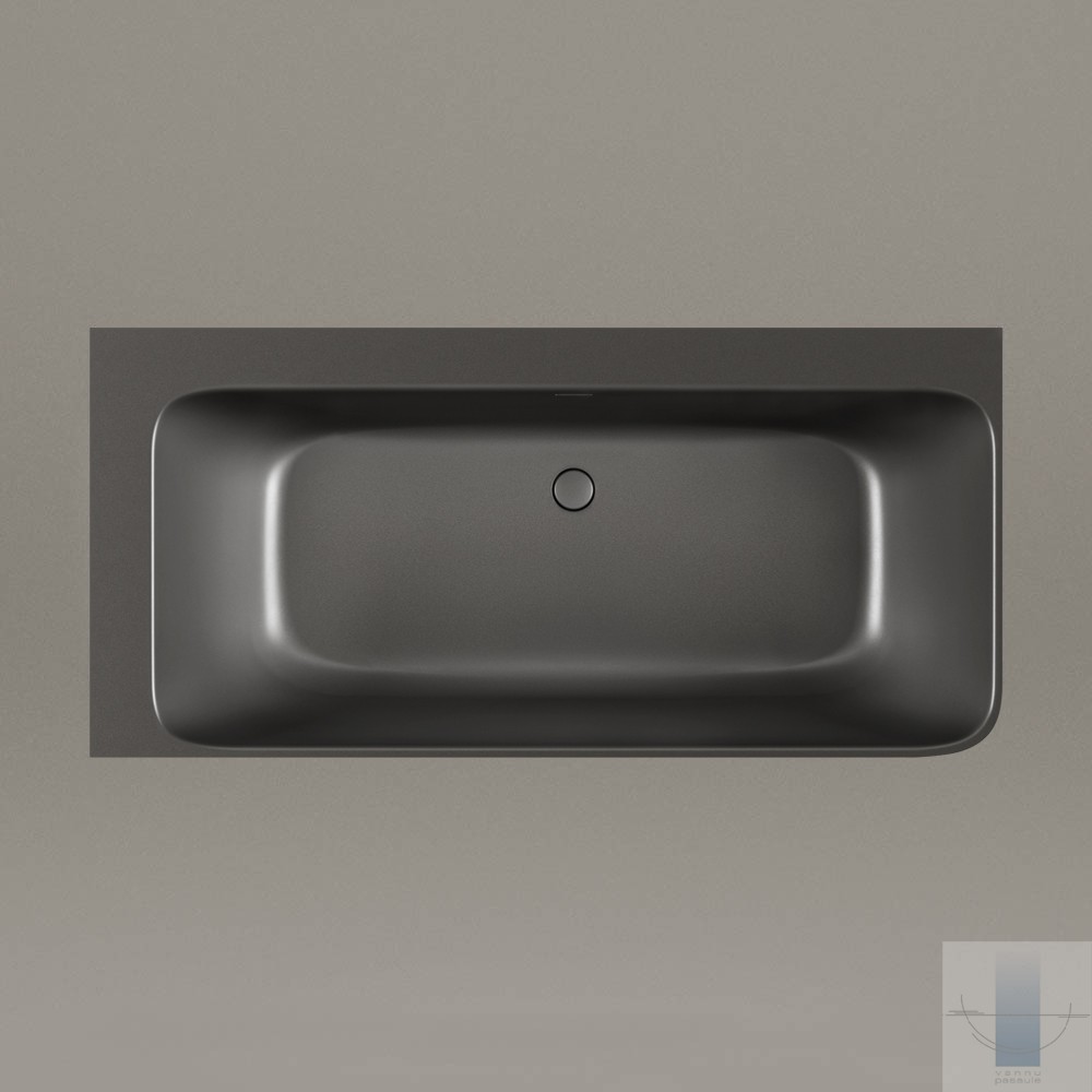 Stūra vanna, kas pilnībā piekļaujas sienām un grīdai. Viegla perimetra līnija un plauktiņš pie sienas. Paredzēta vieta jaucējkrānu montāžai. Izgatavota no Graphite – Silkstone gleznieciskākās, melnās versijas. Ar teksturētu, meistaru rokām veidotu, unikālu virsmu katram izstrādājumam.