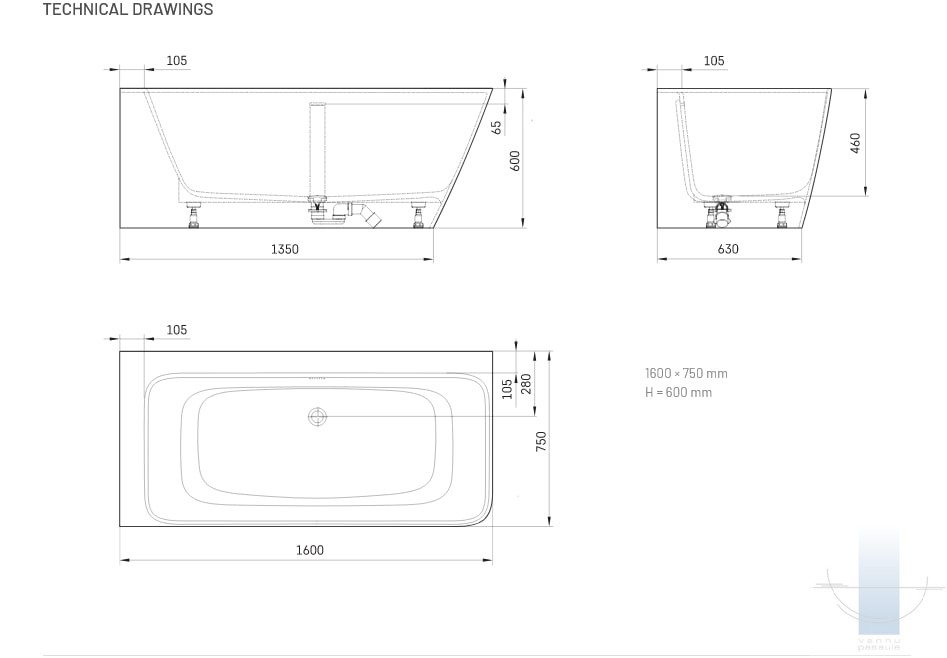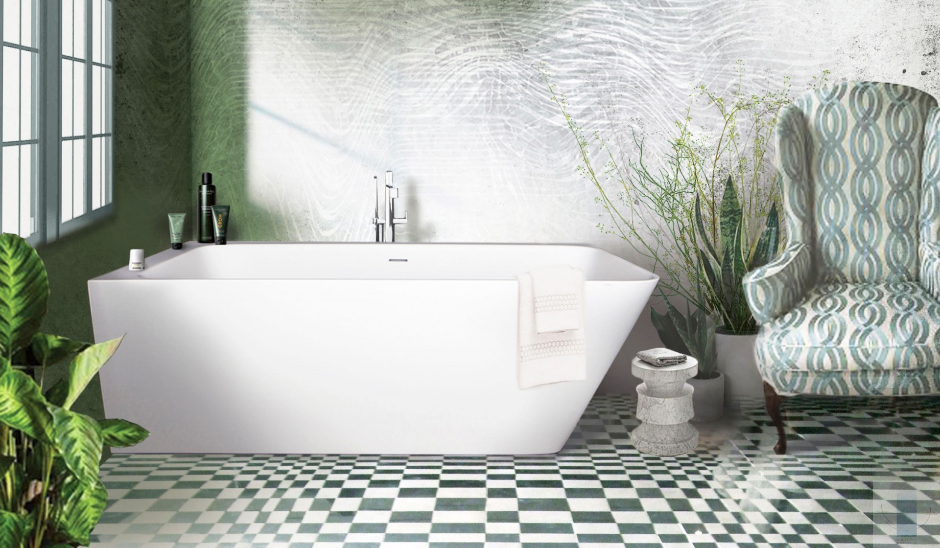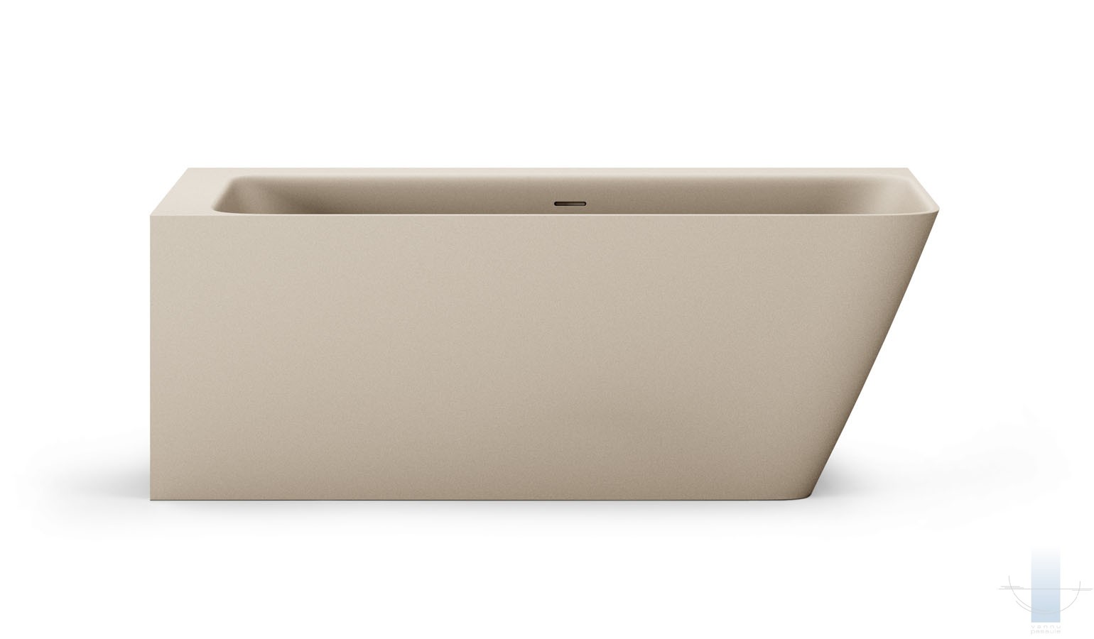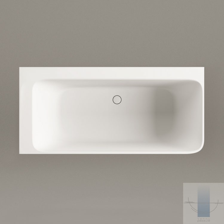 Stūra vanna, kas pilnībā piekļaujas sienām un grīdai. Viegla perimetra līnija un plauktiņš pie sienas. Paredzēta vieta jaucējkrānu montāžai. Izgatavota no Silkstone – cēla un ilgmūžīga materiāla. Cieta kā akmens ar matēti zīdainu, siltu virsmu. Apstrādāta ar rokām.
