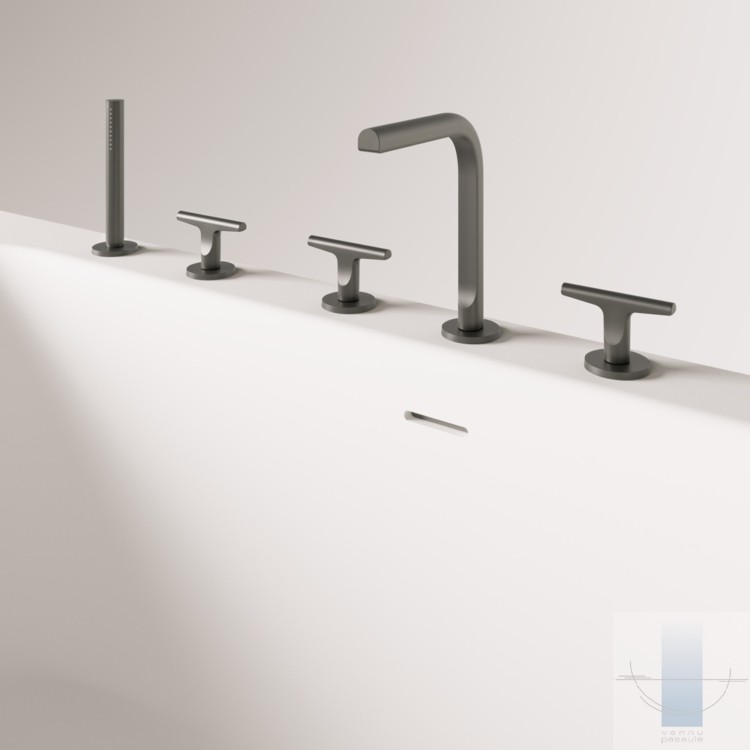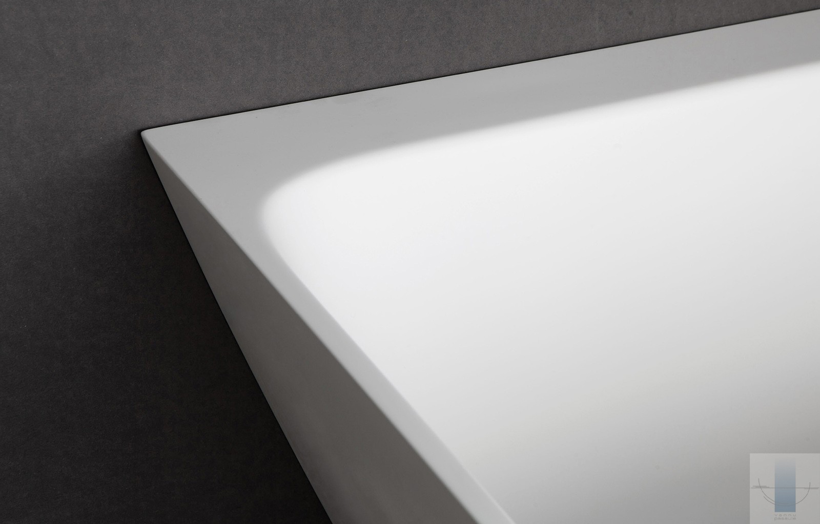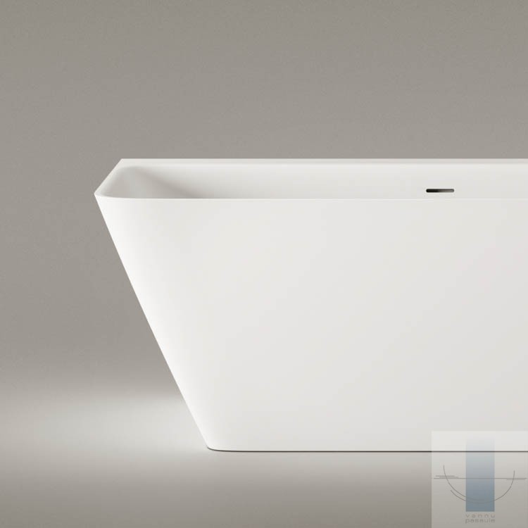 Pie sienas novietojama vanna, kas pilnībā piekļaujas sienai un grīdai. Viegla perimetra līnija un plauktiņš pie sienas. Paredzēta vieta jaucējkrānu montāžai. Izgatavota no akmens masas – pamatīga un stabila materiāla ar klasiski spožu virsmu.