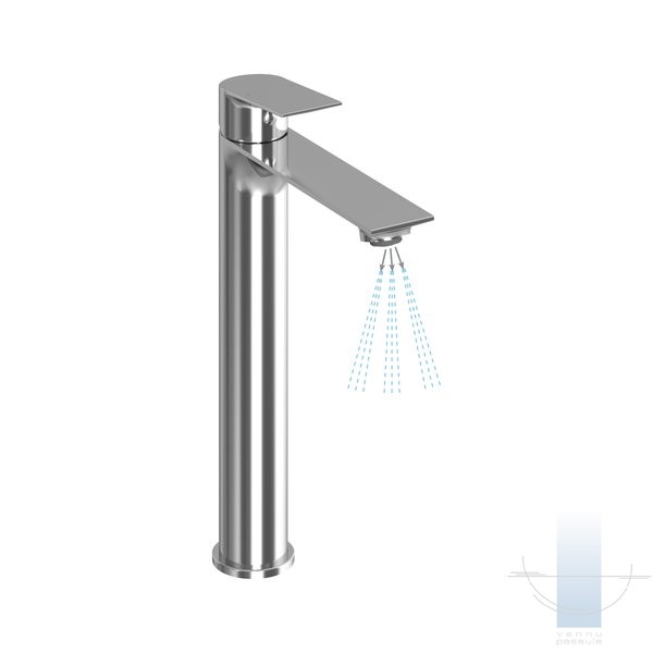 Jaucējkrāna iekšpusē ir viedais aerators ar EcoFlow funkciju. Plūsma ir ierobežota līdz 4,5 l minūtē un bagātināta ar gaisu. Jūs, iespējams, to pat nepamanīsiet, taču tas ietekmēs jūsu ūdens patēriņu, kas būs mazāks nekā ar parasto jaucējkrānu.