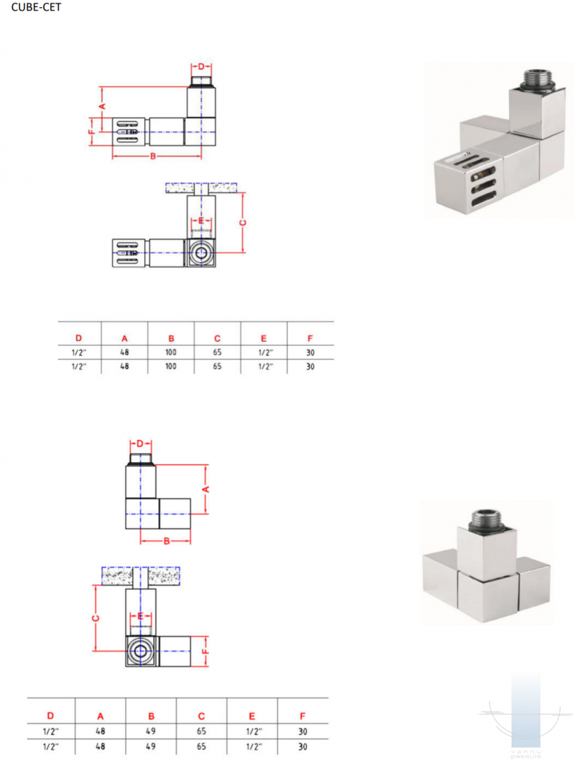 CUBE-CET komplekts ir paredzēts pieslēgšanai vannas istabas radiatoru izvadiem pilnas platuma soļu radiatoriem (sānu pieslēgumi). Šis komplekts sastāv no vadības galvas un aizveramām savienojuma detaļām. Atkarībā no termostata novietojuma komplekts tiek marķēts kā labais vai kreisais. Iesakām izmantot CUBE kompresijas veidgabalus. Komplektā iekļautas arī rozetes savienojuma vāciņi.