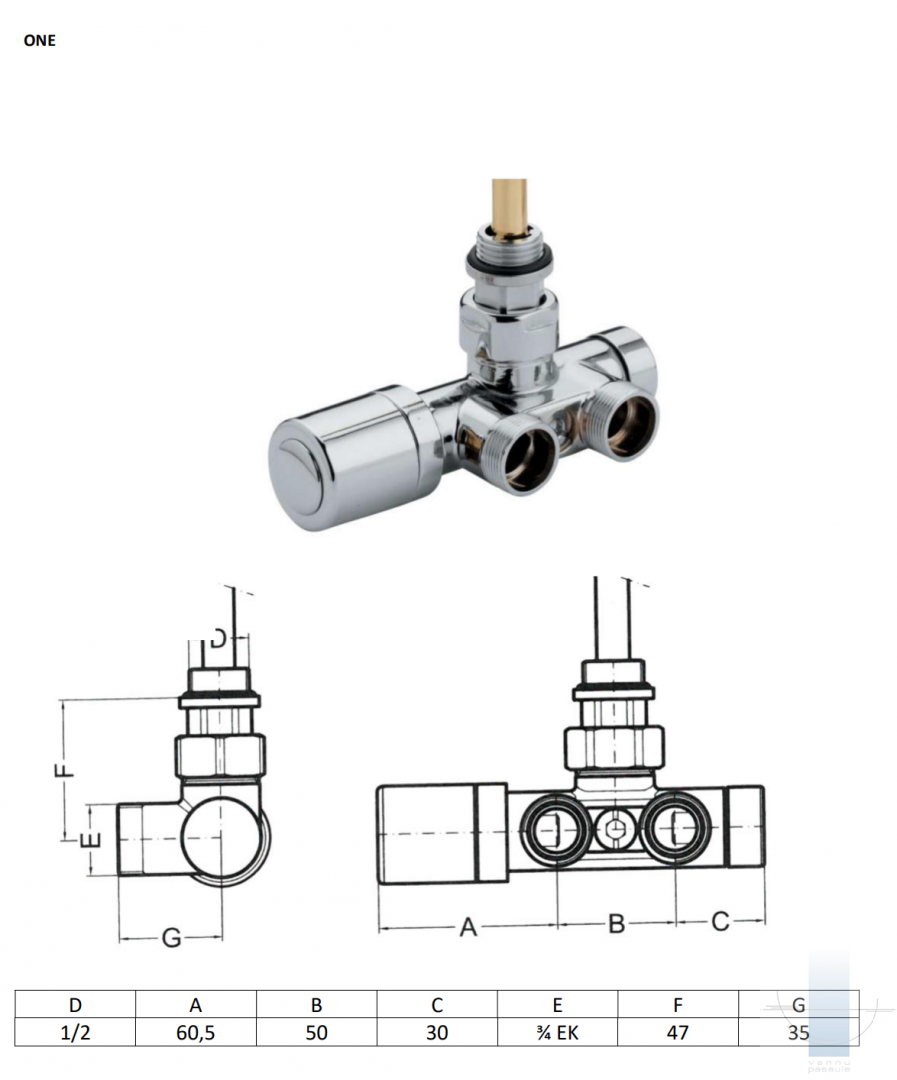 Vārsts ONE ir paredzēts vannas istabas radiatoru pieslēgšanai ar vienu savienojuma punktu. Elektrisko sildīšanas elementu var uzstādīt brīvajā radiatora pusē. Tas ir termostatiskais vārsts. Šim vārstam iesakām izmantot ONE kompresijas savienojumus