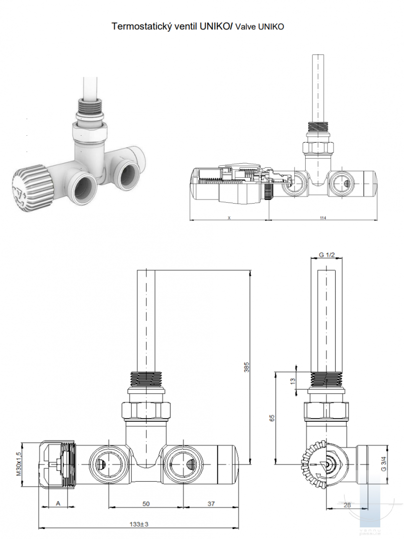 UNIKO vārsts ir paredzēts vannas istabas radiatoru pieslēgšanai vienā pieslēguma punktā ar 50 mm attālumu starp pieslēgumiem.