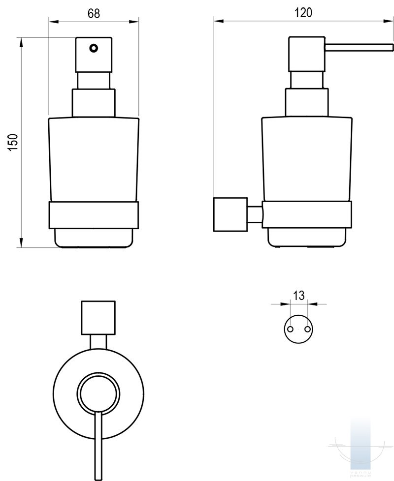 Turētājs ar ziepju dozatoru tiek piestiprināts pie diviem dībeļiem un regulējamas metāla skavas. Skrūvju atstatums ir 13 mm. Stiprinājuma komplekts ir iekļauts iepakojumā. Turētājs iekšpusē ir plastmasas gredzens, kas nodrošina maigu stikla trauka piegulšanu. Pilnvērtīgam vannas istabas dizainam iesakām izvēlēties citus Fold aksesuārus. Ārējās virsmas tīrīšanai iesakām izmantot RAVAK Cleaner Chrome.