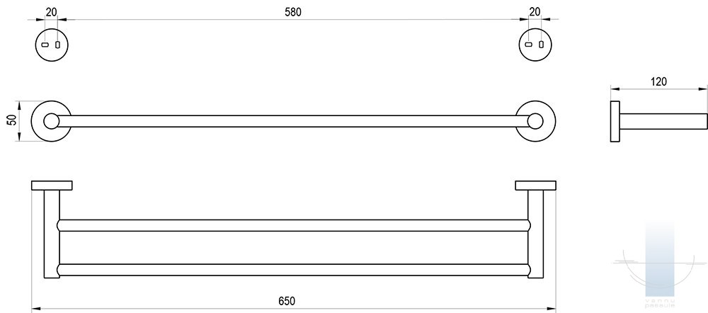 Dubultais dvieļu turētājs ir piestiprināts pie četrām tapām un divām metāla skavas plāksnēm. Skrūvju atstatums ir 20 mm. Stiprinājuma komplekts ir iekļauts iepakojumā. Pilnvērtīgam vannas istabas dizainam iesakām izvēlēties citus Kona aksesuārus. Ārējās virsmas tīrīšanai iesakām izmantot RAVAK Cleaner Chrome.