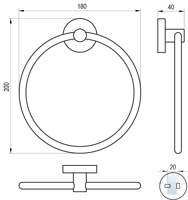 Apaļš dvieļu turētājs ir piestiprināts pie divām tapām un divām metāla skavas plāksnēm. Skrūvju atstatums ir 20 mm. Stiprinājuma komplekts ir iekļauts iepakojumā. Pilnvērtīgam vannas istabas dizainam iesakām izvēlēties citus Kona aksesuārus. Ārējās virsmas tīrīšanai iesakām izmantot RAVAK Cleaner Chrome.
