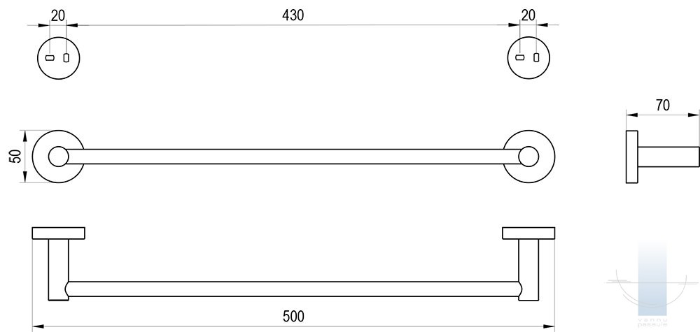 Dvieļu turētājs ir piestiprināts pie diviem tapām un divām metāla skavas plāksnēm. Skrūvju atstatums ir 20 mm. Stiprinājuma komplekts ir iekļauts iepakojumā. Pilnvērtīgam vannas istabas dizainam iesakām izvēlēties citus Kona aksesuārus. Ārējās virsmas tīrīšanai iesakām izmantot RAVAK Cleaner Chrome.