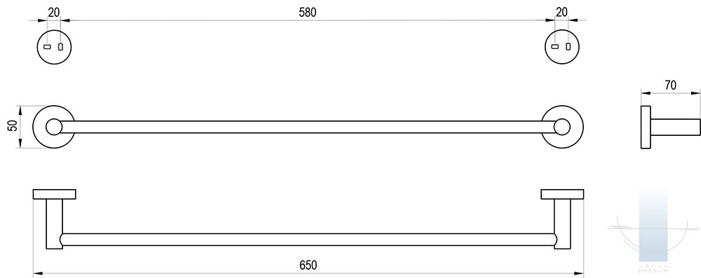 Dvieļu turētājs ir piestiprināts pie diviem tapām un divām metāla skavas plāksnēm. Skrūvju atstatums ir 20 mm. Stiprinājuma komplekts ir iekļauts iepakojumā. Pilnvērtīgam vannas istabas dizainam iesakām izvēlēties citus Kona aksesuārus. Ārējās virsmas tīrīšanai iesakām izmantot RAVAK Cleaner Chrome.