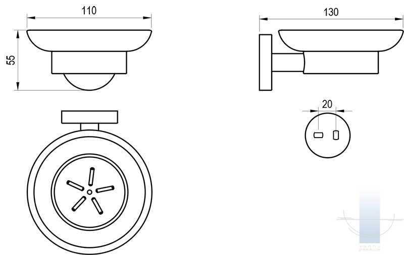 Tureklis ar ziepju trauku tiek piestiprināts pie diviem dībeļiem un regulējamas metāla skavas. Skrūvju atstatums ir 20 mm. Stiprinājuma komplekts ir iekļauts iepakojumā. Turētājs iekšpusē ir plastmasas gredzens, kas nodrošina maigu stikla trauka piegulšanu. Pilnvērtīgam vannas istabas dizainam iesakām izvēlēties citus Kona aksesuārus. Ārējās virsmas tīrīšanai iesakām izmantot RAVAK Cleaner Chrome.