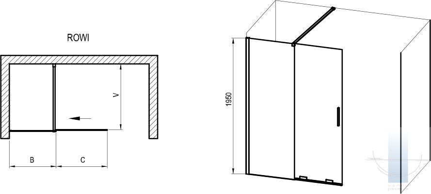 Divdaļīgo "Walk-In" tipa dušas kabīni ROWI veido montāžas profils un dušas siena, kas sastāv no fiksētas un bīdāmas daļas; bīdāmā daļa pārvietojas pa sliedi ar apakšējo ritentiņu palīdzību. Izstrādājuma stabilitāti nodrošina 100 cm garš metāla atbalsta stienis, ko var saīsināt atbilstoši vēlamajam ieejas platumam. Kreisās vai labās puses ieejas variantu iegūst, montāžas laikā pārvietojot fiksēto stiklu uz kreiso vai labo pusi un pagriežot bīdāmo daļu par 180° vertikālā plaknē. Iesakām uzstādīt flīzētā vannas istabas stūrī tieši uz grīdas ar iebūvētu noteku vai grīdas noteku. Maksimālais platums (1000 mm) nodrošina pietiekami daudz vietas ērtai mazgāšanai. Iebīdot bīdāmo daļu, kopējo dušas sienas platumu iespējams samazināt gandrīz uz pusi.
