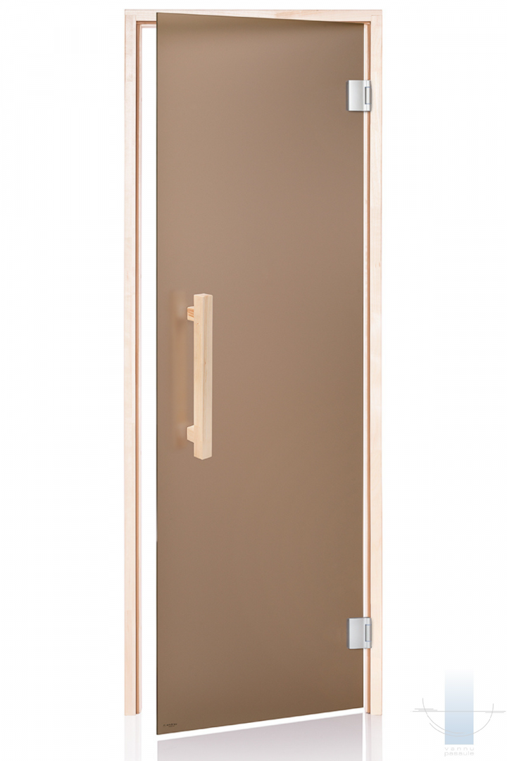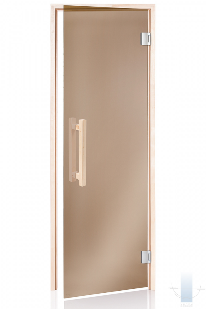Saunas durvis tiek izgatavotas no 8 mm rÅ«dÄ«ta stikla. Durvju komplektÄcija iespÄ“jama ar dažÄdu veidu tonÄ“tiem stikliem: pelÄ“ks, bronza. Saunas durvju kÄrba izgatavota no lÄ«mÄ“tas lapu koka koksnes. Saunas durvÄ«m izmanto speciÄli stikla vÄ“rtnÄ“m paredzÄ“tas firmas “Abloy” eņģes KS-6540, FL-48; firmas “Abloy” fiksators “Abloy-4238”. Saunas durvÄ«m ir kÄrbas blÄ«vÄ“jums – karstumizturÄ«gs silikons.
