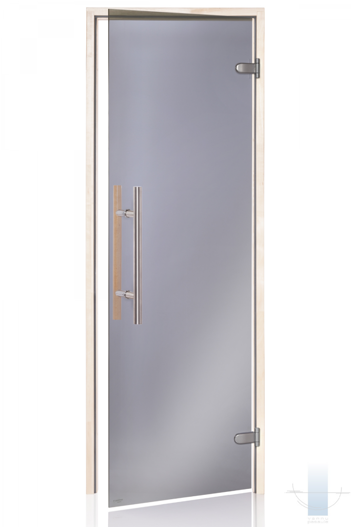 Saunas durvis tiek izgatavotas no 8 mm rūdīta stikla. Durvju komplektācija iespējama ar dažādu veidu tonētiem stikliem: pelēks, bronza. Saunas durvju kārba izgatavota no līmētas lapu koka koksnes. Saunas durvīm izmanto speciāli stikla vērtnēm paredzētas firmas “Abloy” eņģes KS-6540, FL-48; firmas “Abloy” fiksators “Abloy-4238”. Saunas durvīm ir kārbas blīvējums – karstumizturīgs silikons.